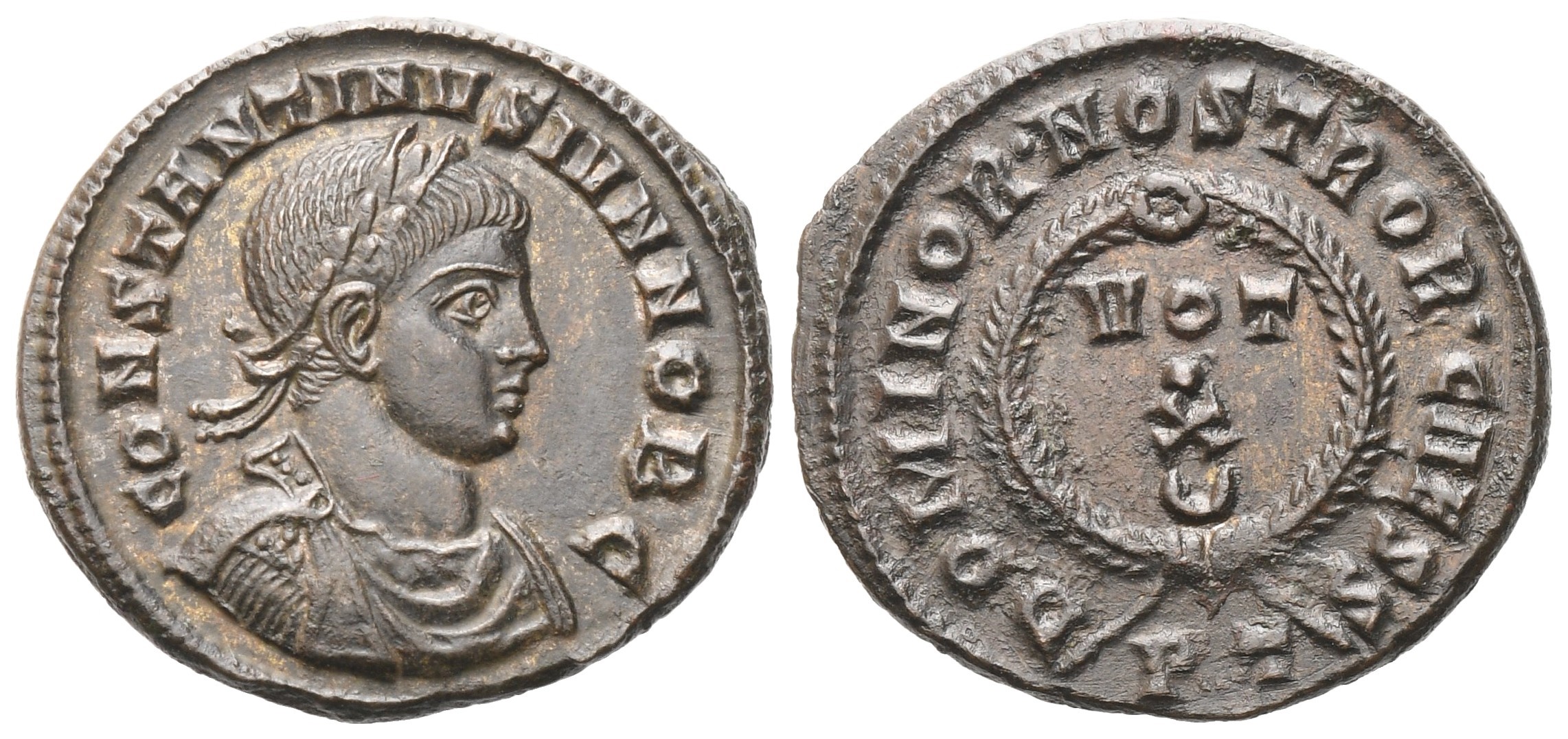CONSTANTINVS IVN NOB C Laureate, draped and cuirassed bust of Constantine II to r.; Rv. DOMINOR·NOSTROR·CAESS / PT Large wreath with VOT / X / (crescent) within. RIC 172. Good extremely fine.
