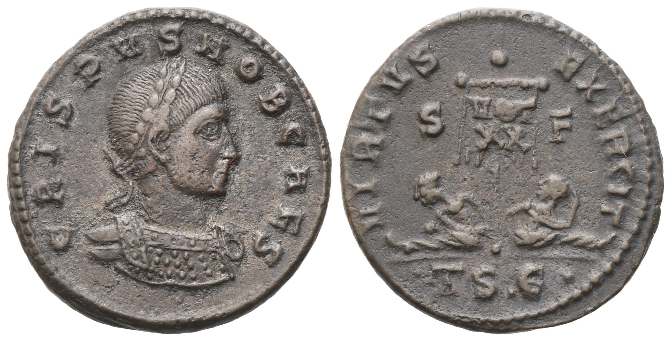 CRISPVS NOB CAES Laureate and cuirassed bust r.; Rv. VIRTVS - EXERCIT Standard inscribed VOT / XX with captives seated on either sides; across fields, S - F; in exergue, TSЄ. RIC 77; Cohen 166. Very fine.