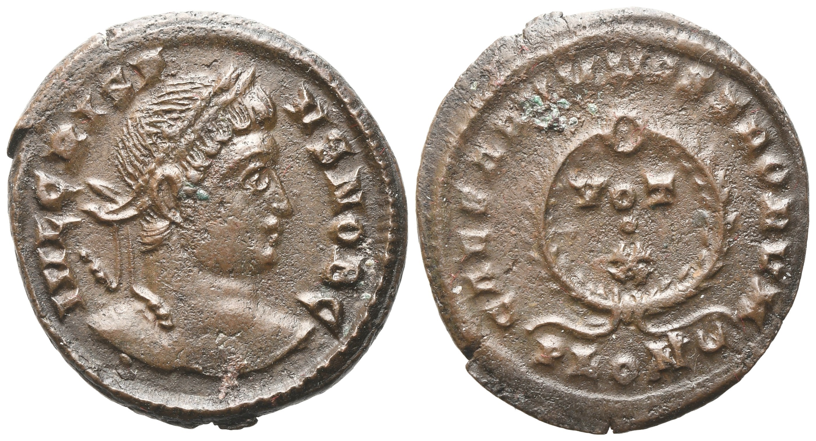 IVL CRISP-VS NOB C Laureate head r.; Rv. CAESARVM NOSTRORVM / VOT · X in laurel wreath; P LON (crescent) in exergue. RIC VII 291. Dark brown patina. gVF.
