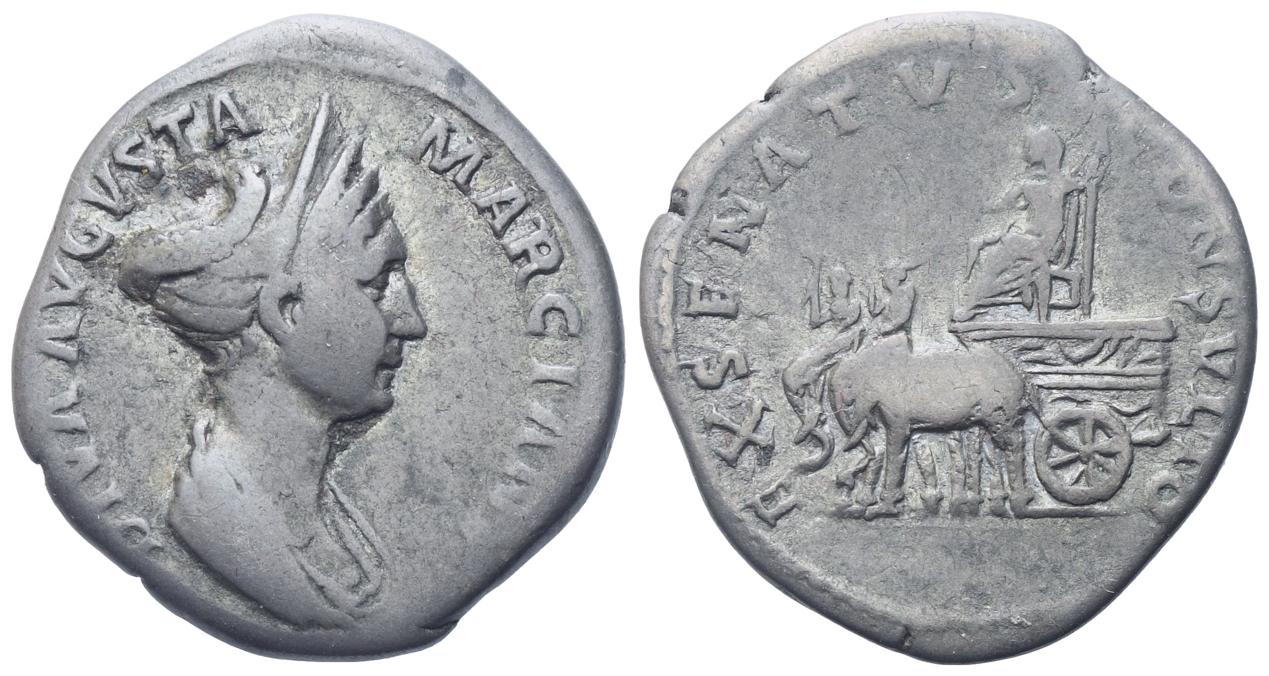 DIVA AVGVSTA MARCIANA Diademed and draped bust r.; Rv. EX SENATVS CONSVLTO Marciana (or Vesta), seated on carriage drawn l. by two elephants with mahouts. RIC II (Trajan) 747. Very fine.