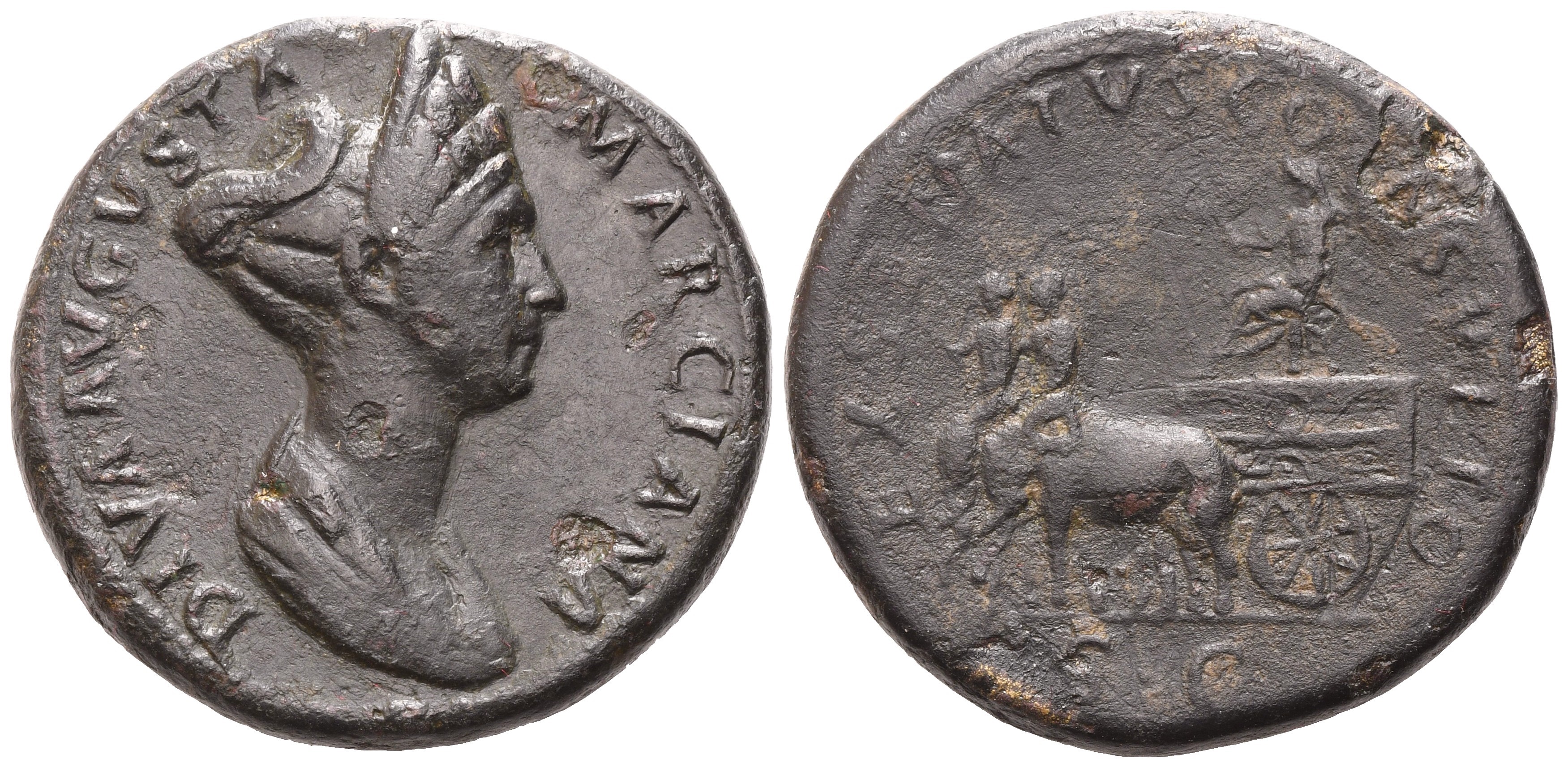 Diva Marciana, Sestertius struck under Trajan, Rome, c. AD 112-117; Γ (g 27,15; mm 33); DIVA AVGVSTA - MARCIANA, draped bust r., hair elaborately dressed over brow, above which is a stephane, braided and bound up at the back, Rv. EX SENATVS CONSVLTO, Diva Marciana, holding patera and sceptre, seated l. on cart drawn by two elephants, each with its own mahout; in ex. S C. RIC 750; C 13.Very rare. Dark patina; somewhat smoothed; very fine.