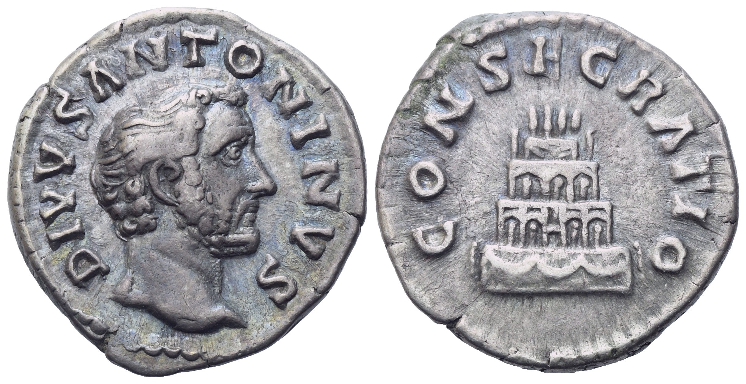 DIVVS ANTONINVS Bare head r.; Rv. CONSECRATIO Funeral pyre of four tiers surmounted by facing quadriga. RIC 436; RSC 164. Nice iridescence. Good very fine.