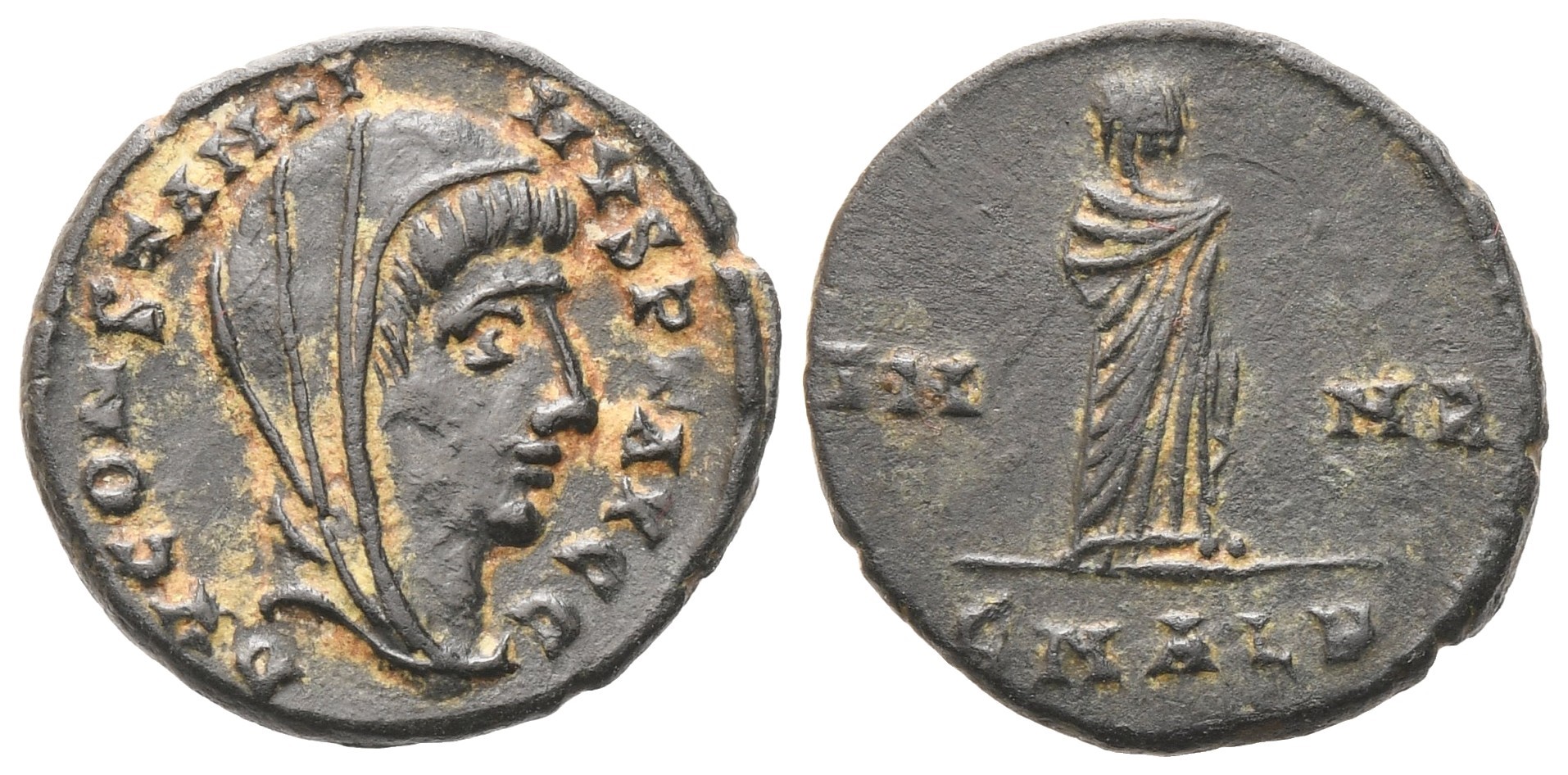 DV CONSTANTINVS PT AVGG Veiled bust to r.; Rv. VN-MR to l. and r. of Constantine shrouded, standing front, looking right; SMALB in exergue. RIC 32. Dark brown patina with lighter hues. gVF