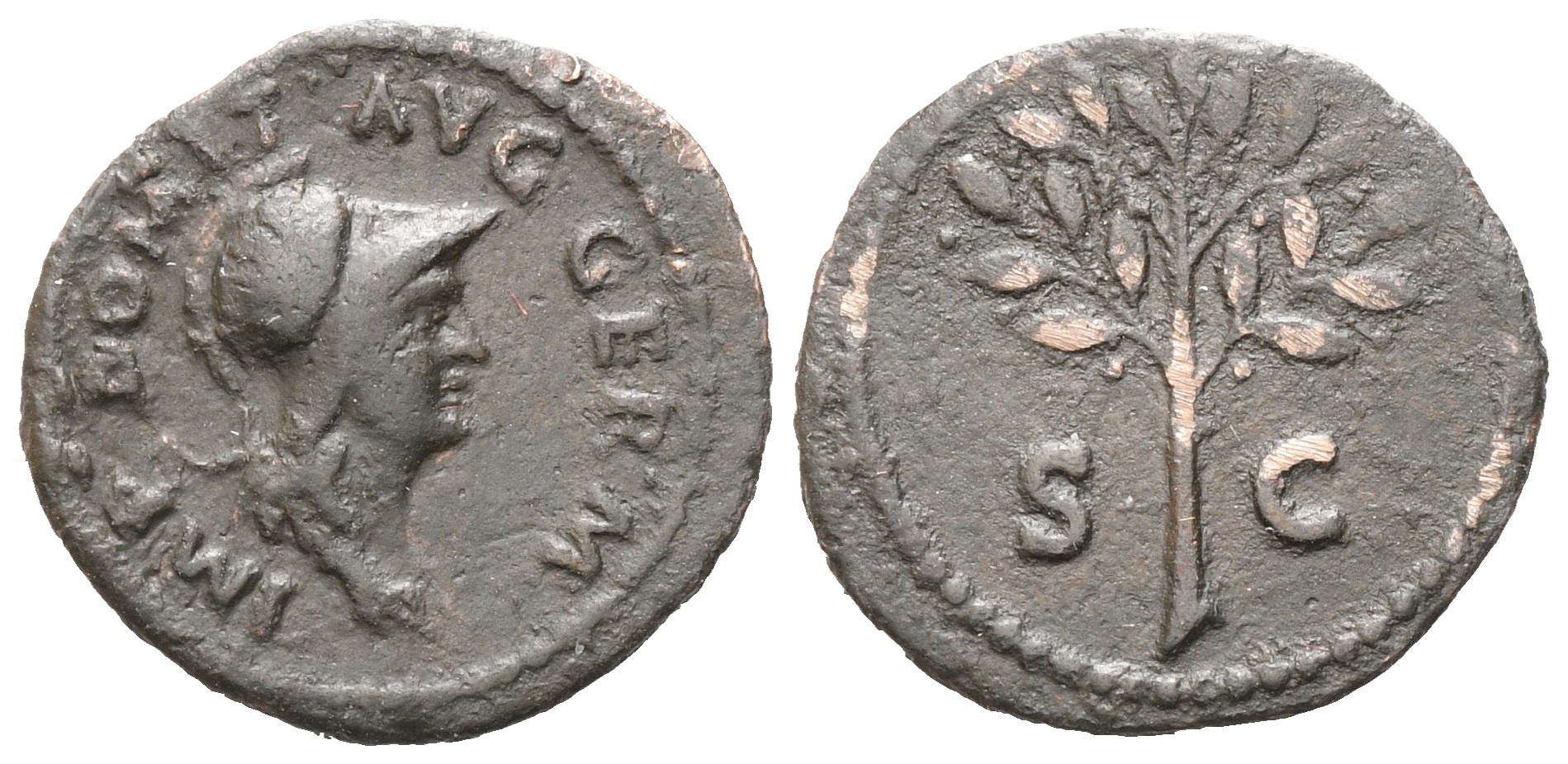 IMP DOMIT AVG GERM Head of Minerva r., wearing crested helmet; Rv. Olive branch; S-C across fields. RIC 428; Cohen 544. Dark brown patina. Good very fine.