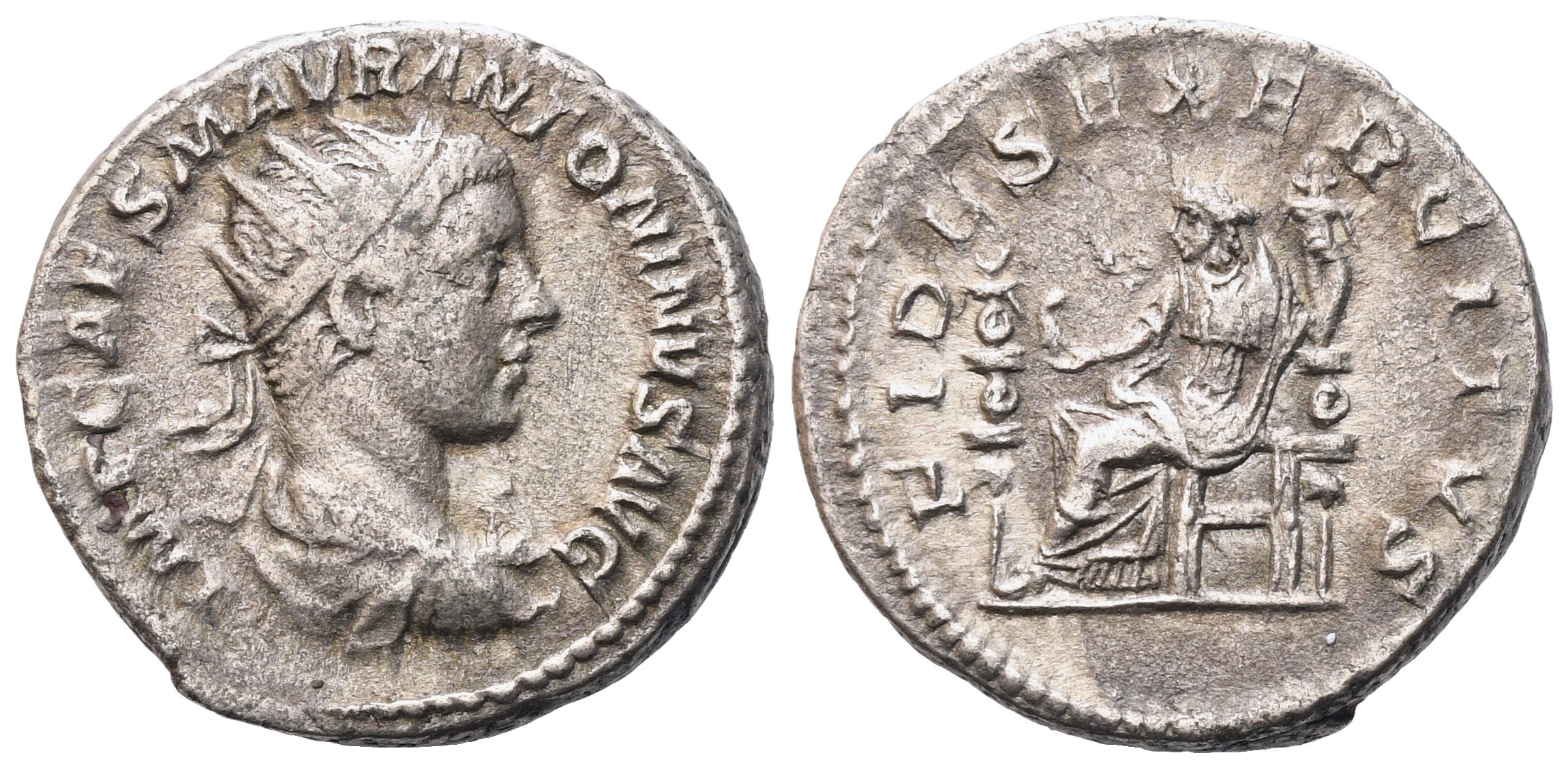 IMP CAES M AVR ANTONINVS AVG Radiate and draped bust to r.; Rv. FIDES EXERCITVS Fides seated to l., holding eagle and standard; before her, another standard. RIC IV 70; BMCRE 12; RSC 31a. gVF