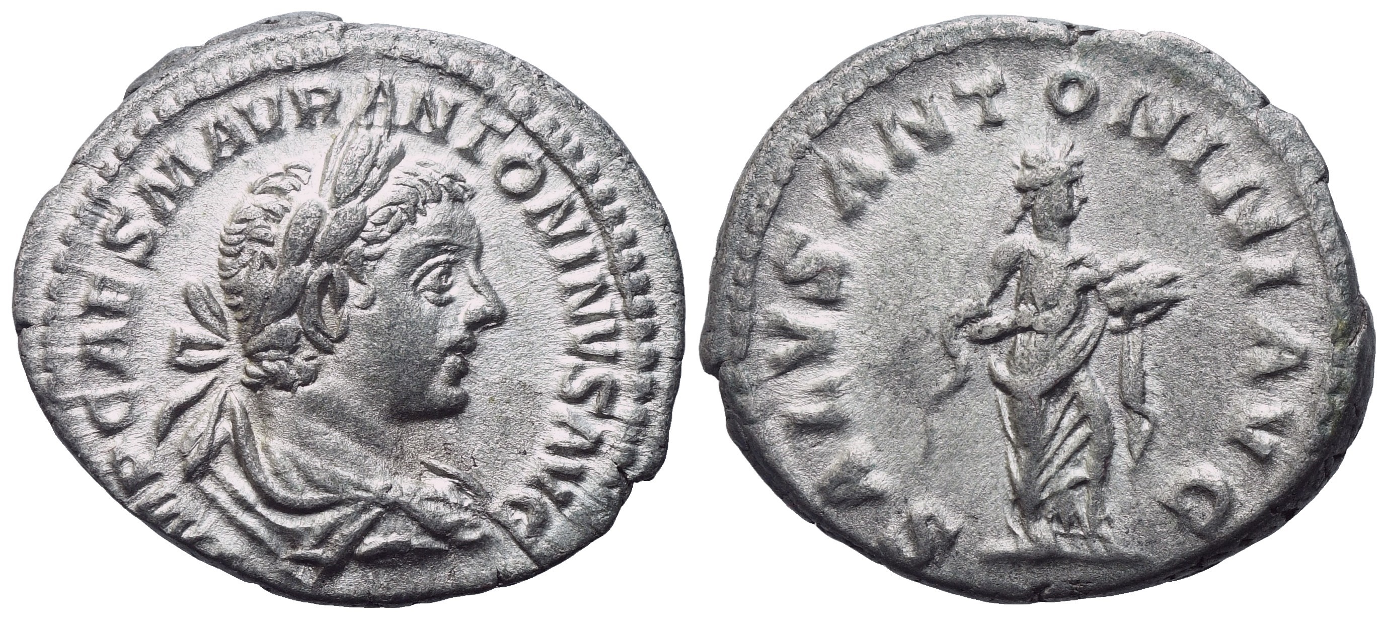 IMP CAES M AVR ANTONINVS AVG Bust of Elagabalus, laureate, draped, r.; Rv. SALVS ANTONINI AVG: Salus, draped, standing r., feeding snake held in her arms out of dish in left hand. RIC IV 140B. aEF / gVF