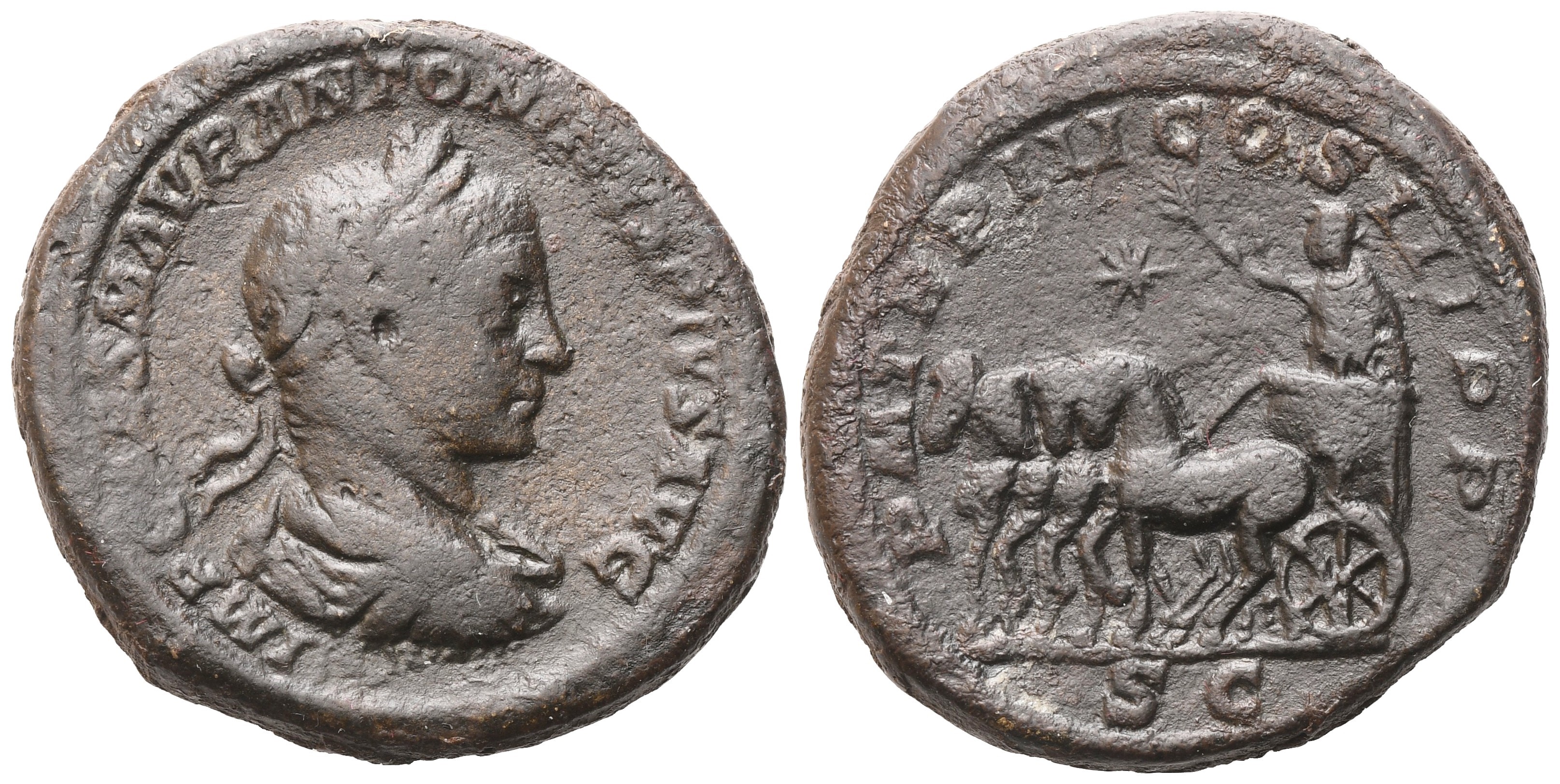 IMP CAES M AVR ANTONINVS PIVS AVG Laureate and draped bust r.; Rv. PM TRP III COS III PP / S β C Elagabalus driving slow quadriga l., holding olive branch and eagle-tipped scepter; star above. RIC IV 308; Thirion 155; Banti 30. Dark brown patina with reddish undertones. VF