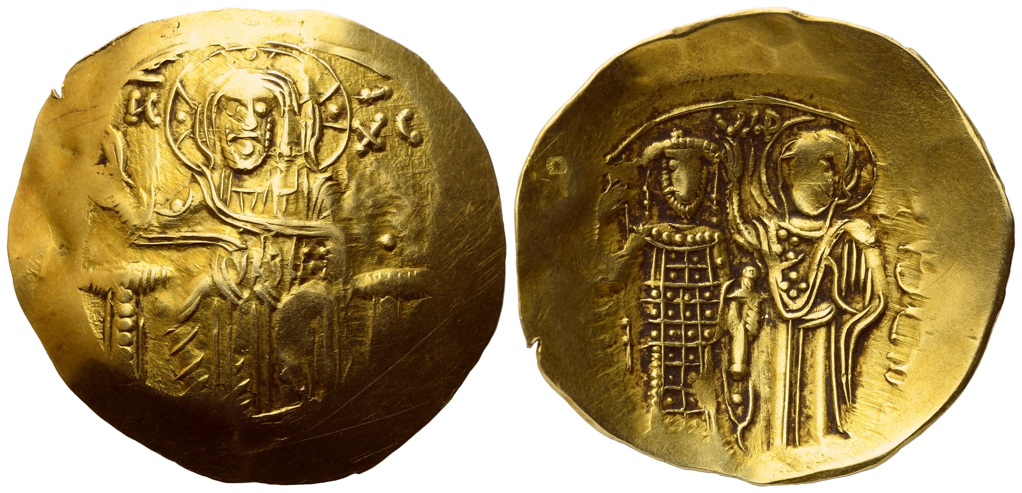 Christ, nimbate, seated facing on throne, wearing tunic and pallium, raising His right hand in benediction and holding book of Gospels in His left; in field to left and right, IC - XC; in field to left, cross; Rv./ John III standing facing on the left, wearing divitision and loros, holding anexikakia in his left hand and labarum in his right, crowned by the Virgin Mary, nimbate, standing facing on the right. DOC 4ff. SB2073. About About extremely fine.