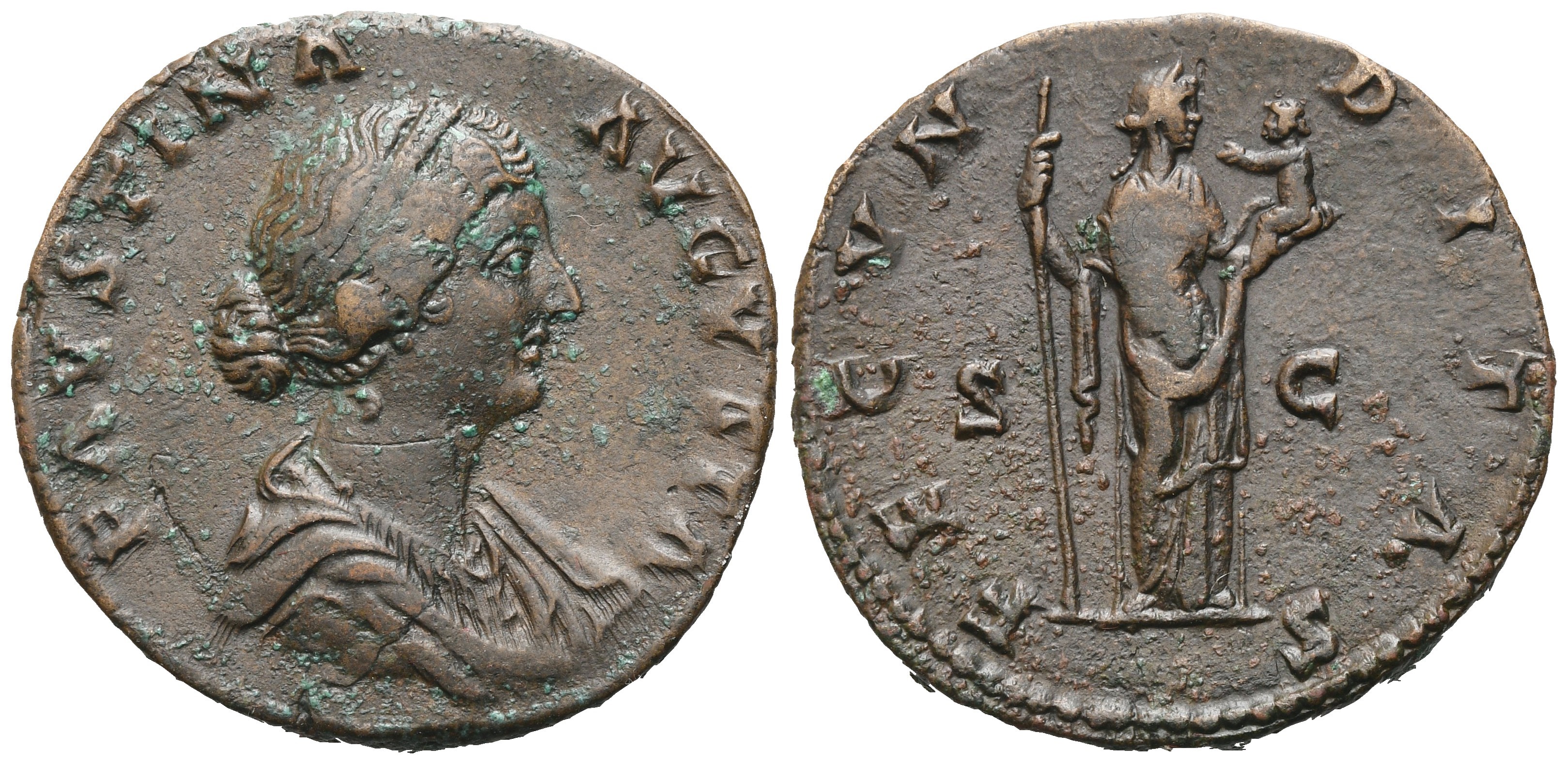 FAVSTINA AVGVSTA, draped bust of Faustina to r.; Rv. FECVNDITAS / S β C Fecunditas standing front, her head turned to r., holding long vertical sceptre with her r. hand and child in her l. BMC 905 (Marcus Aurelius); Cohen 100; RIC 1638 (Marcus Aurelius). Dark brown patina. VF