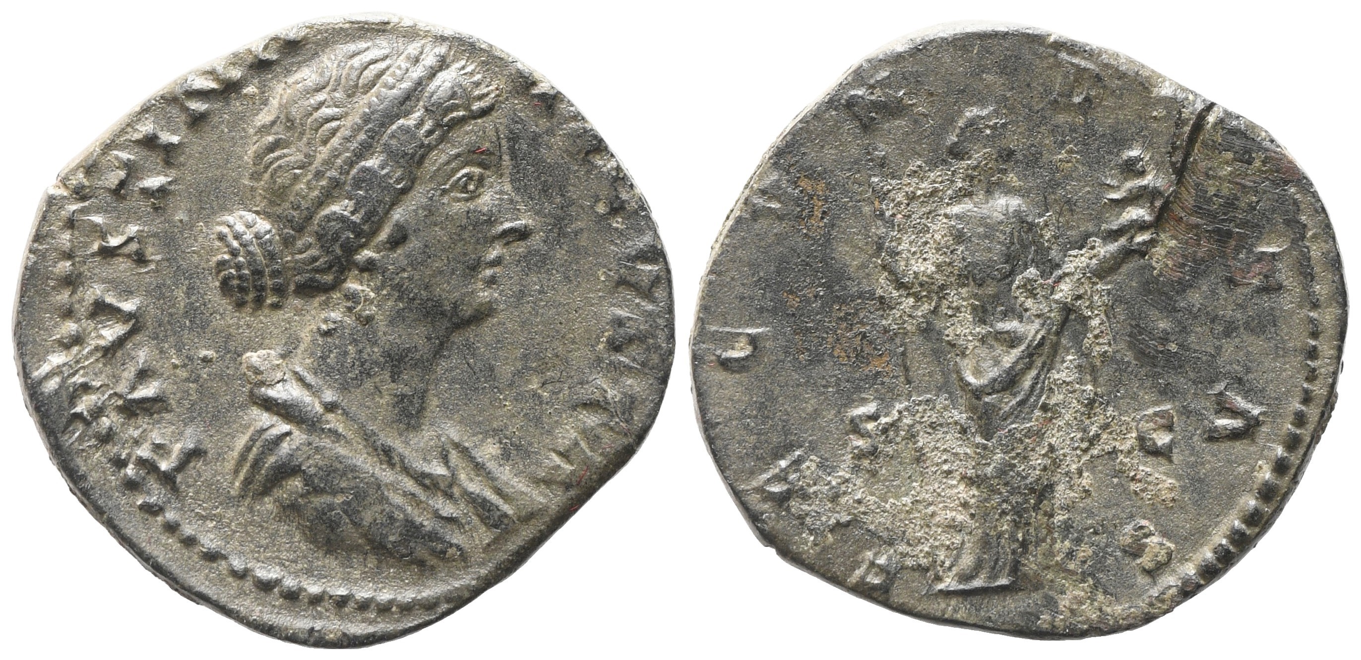 FAVSTINA AVGVSTA Draped bust right; Rv. FECVNDITAS / S C Fecunditas standing r., holding sceptre and infant. RIC 1638 (Aurelius); Cohen 100. dark brown patina. Some encrustations on the reverse, otherwise very fine.
