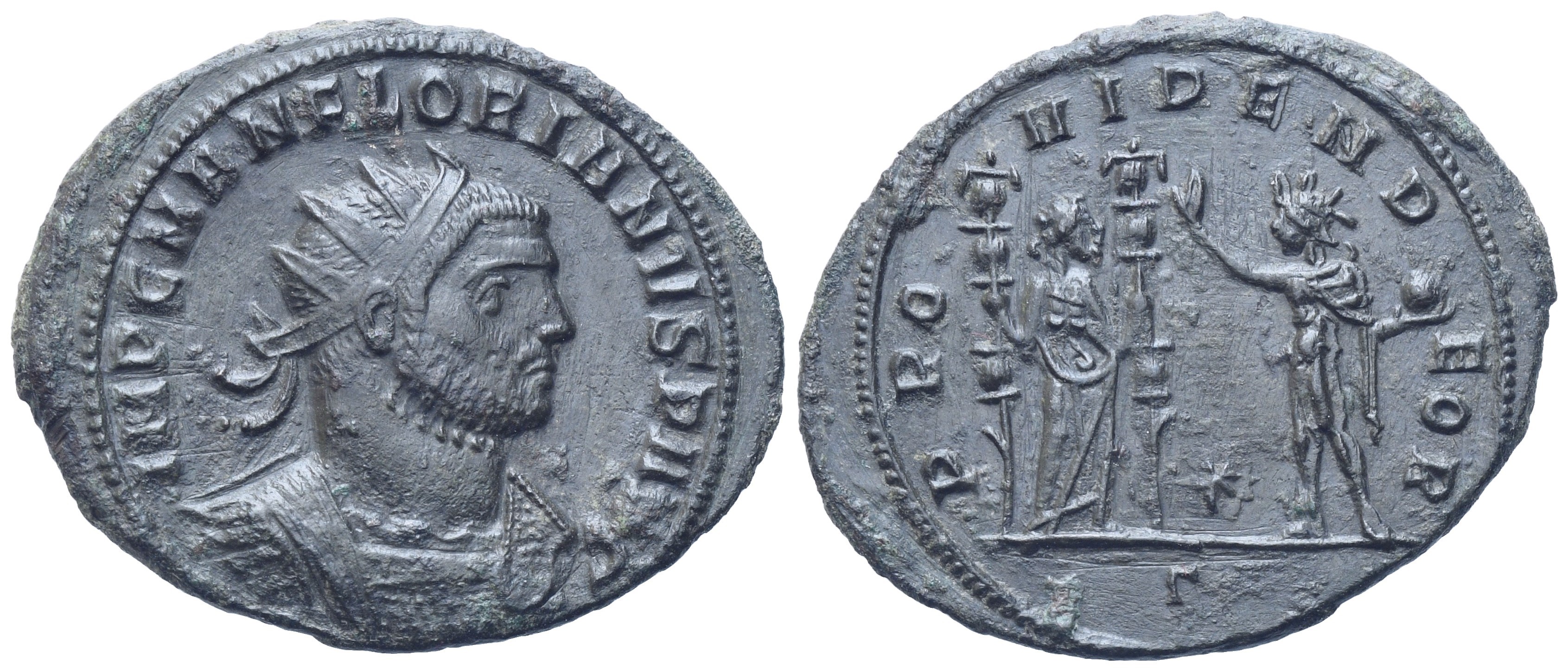IMP C M AN FLORIANVS P AVG Radiate, draped and cuirassed bust r.; Rv. PROVIDEN DEOR, Fides standing r., holding signum in each hand, Sol standing l., raising hand and holding globe; star between figures, Ξ in exergue. RIC 110 var. (mintmark). Extremely fine.