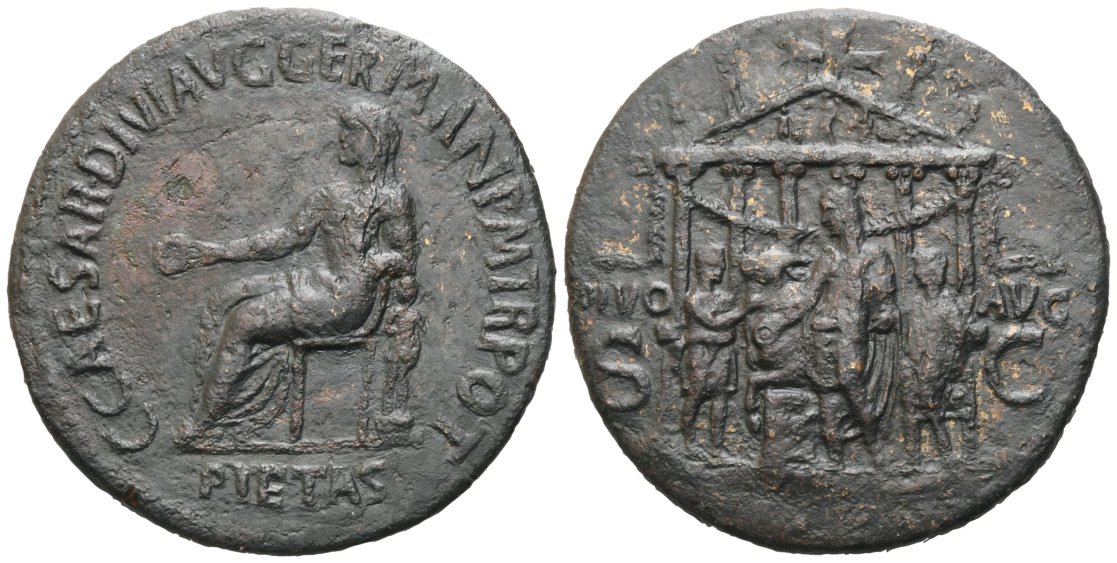 C CAESAR DIVI AVG GERMAN PM TR POT Gaius seated l. holding patera; in ex.PIETAS; Rv. DIVO- AVG / S-C Hexastyle temple surmonted by quadriga; before Gaius veiled and togate sacrifices with patera over altar; one attendant leads bull to the altar; a second holds patera. RIC 36. Dark brown patina with slighter spots. Good very fine.