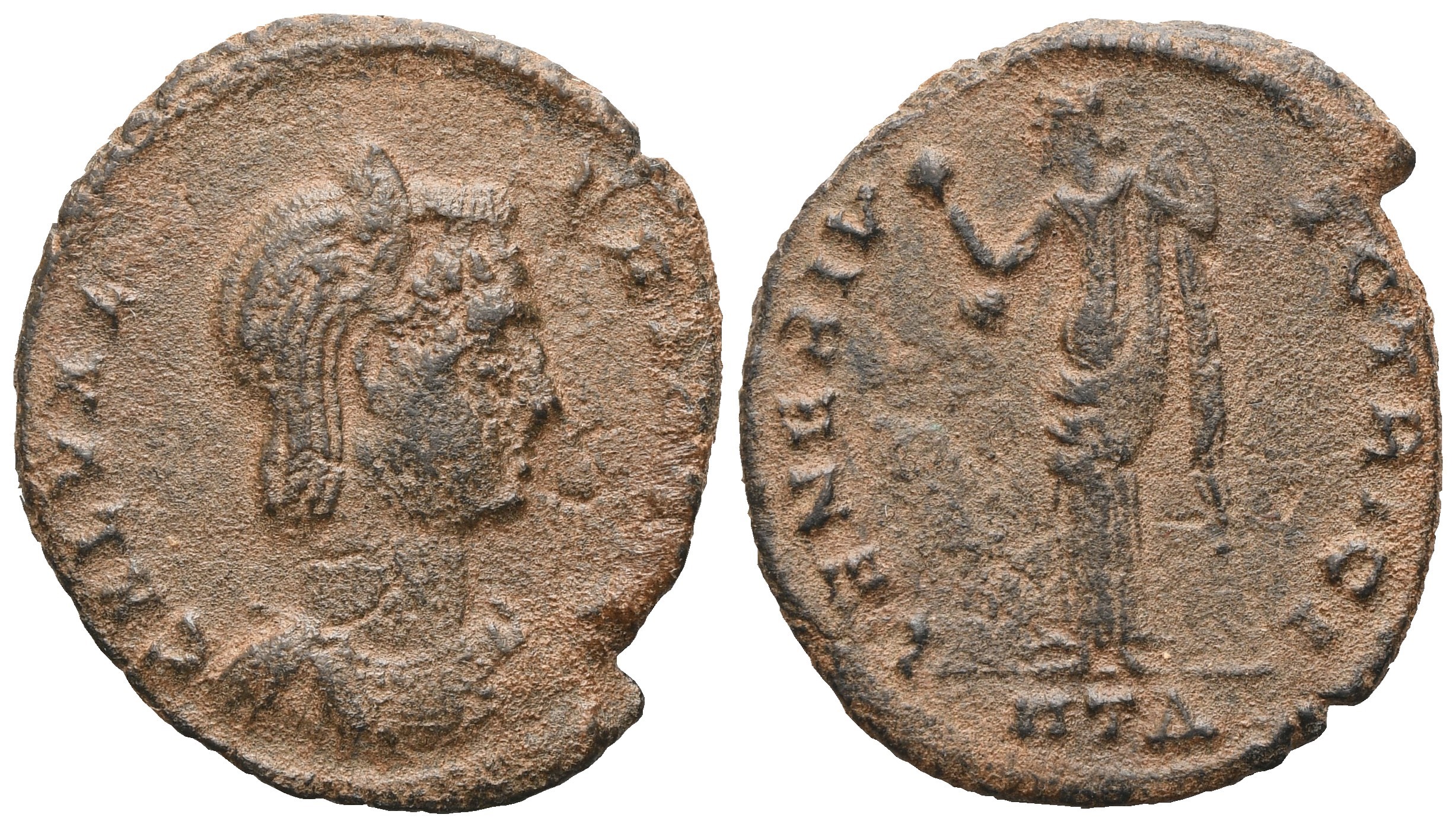 GAL VAL-ERIA AVG Pearl-diademed and draped bust of Galeria Valeria to r.; Rv. VENERI VICTRICI Venus standing facing, head l., holding apple and raising drapery over shoulder; HTA in exergue. RIC VI, 43. Reddish brown patina. VF