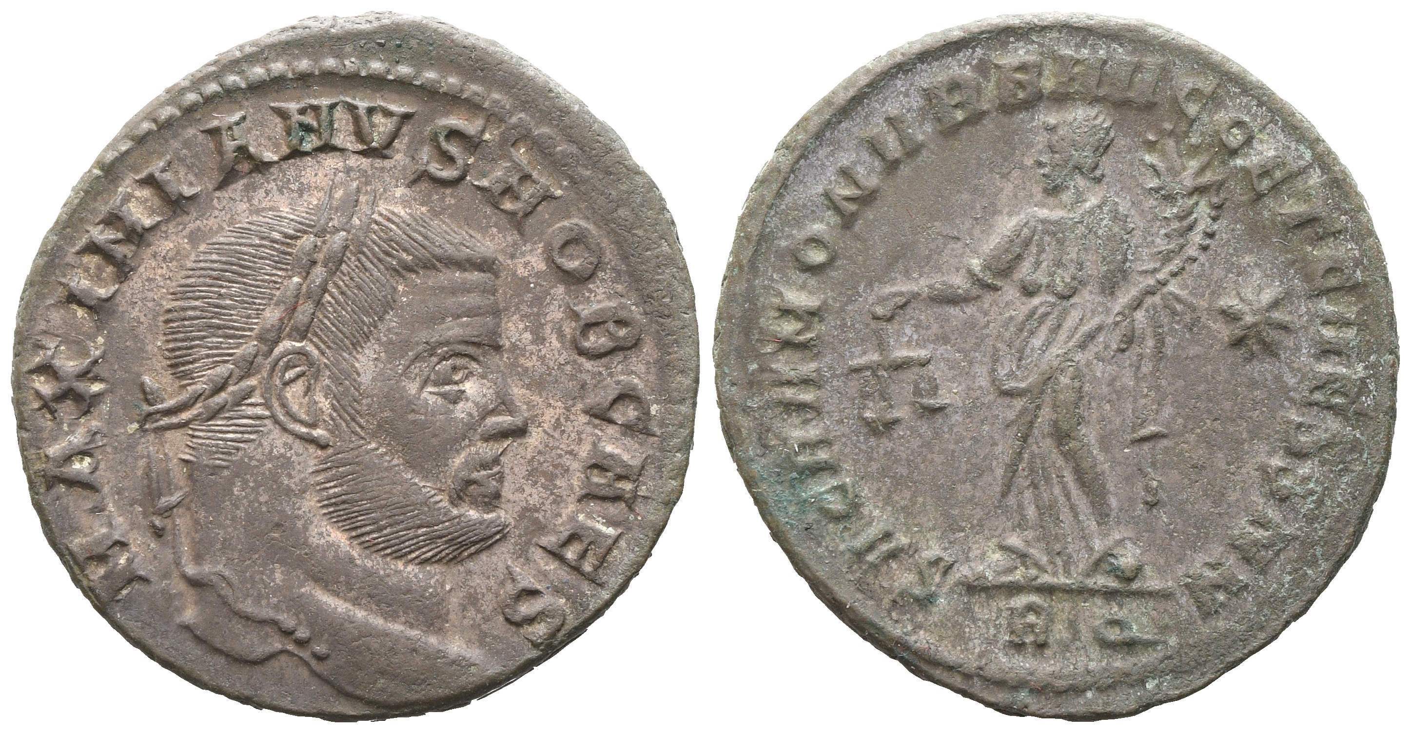 MAXIMIANVS NOB CAES Laureate head of Galerius to r.; Rv. SACRA MON VRB AVGG ET CAESS NN / RQ Moneta standing front, head to left, holding scales in her right hand and cornucopiae in her left; in field to right, *. RIC 104b. gVF