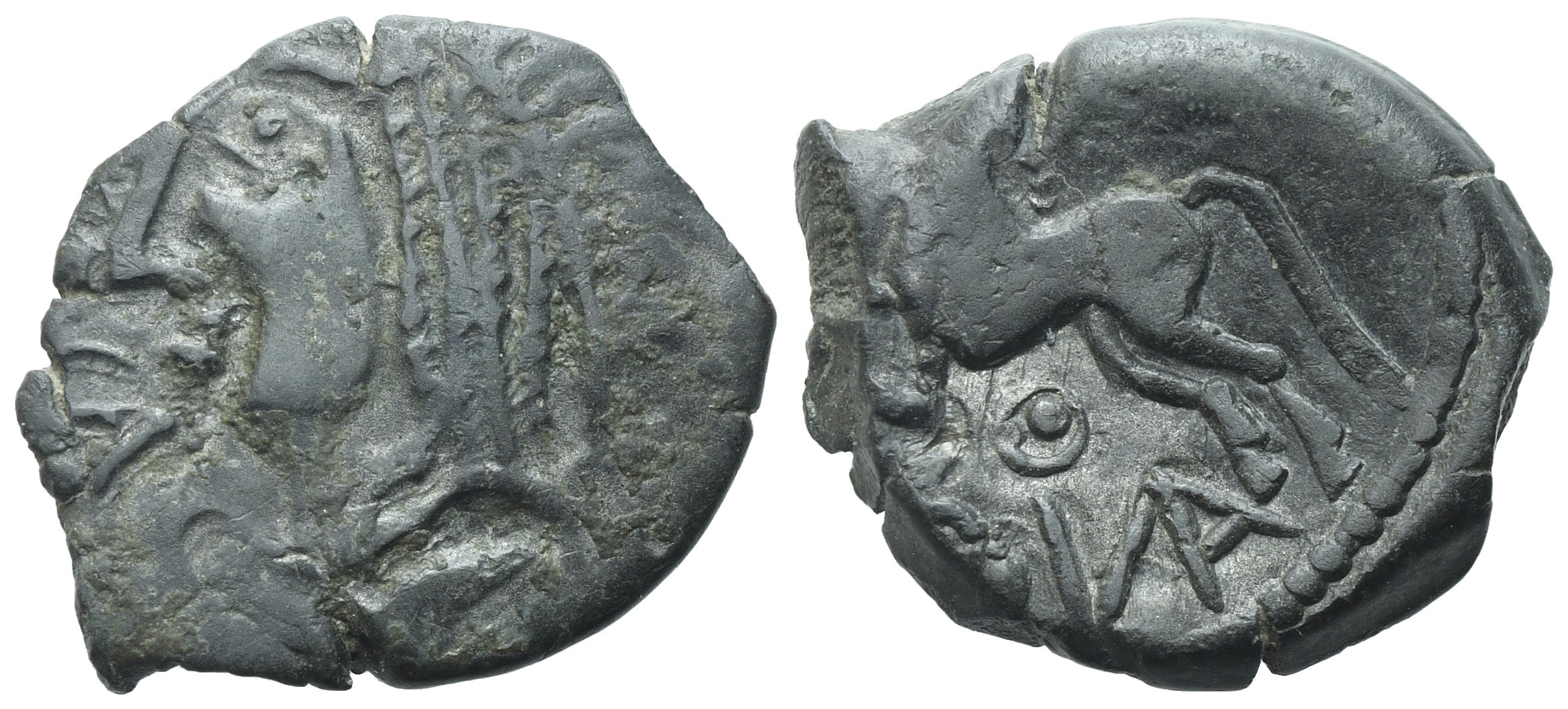 [RO]VECA Large head on the l., hair in large twisted locks, a torque and a fold of clothing on the neck; Rv.: [POOYI]KA Horse leaping l., three rings pointed above the horse and another between the legs. Ref : LT.manque DT.580 RIG.242 Sch/GB.207C série 28 BN.7700A, 10343 série 67. Dark patina. Good VF