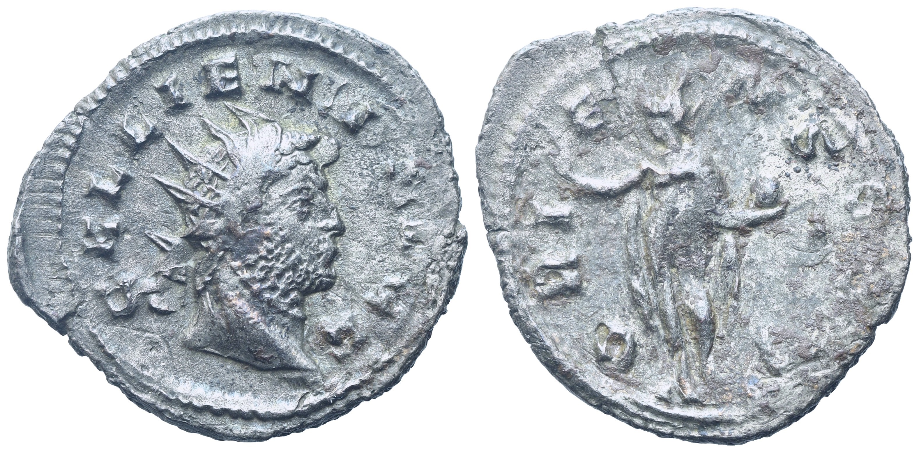 GALLIENVS AVG Radiate head r.; Rv. ORIENS AVG Radiate Sol standing L., holding globe and raising right hand. RIC 495. VF / aVF