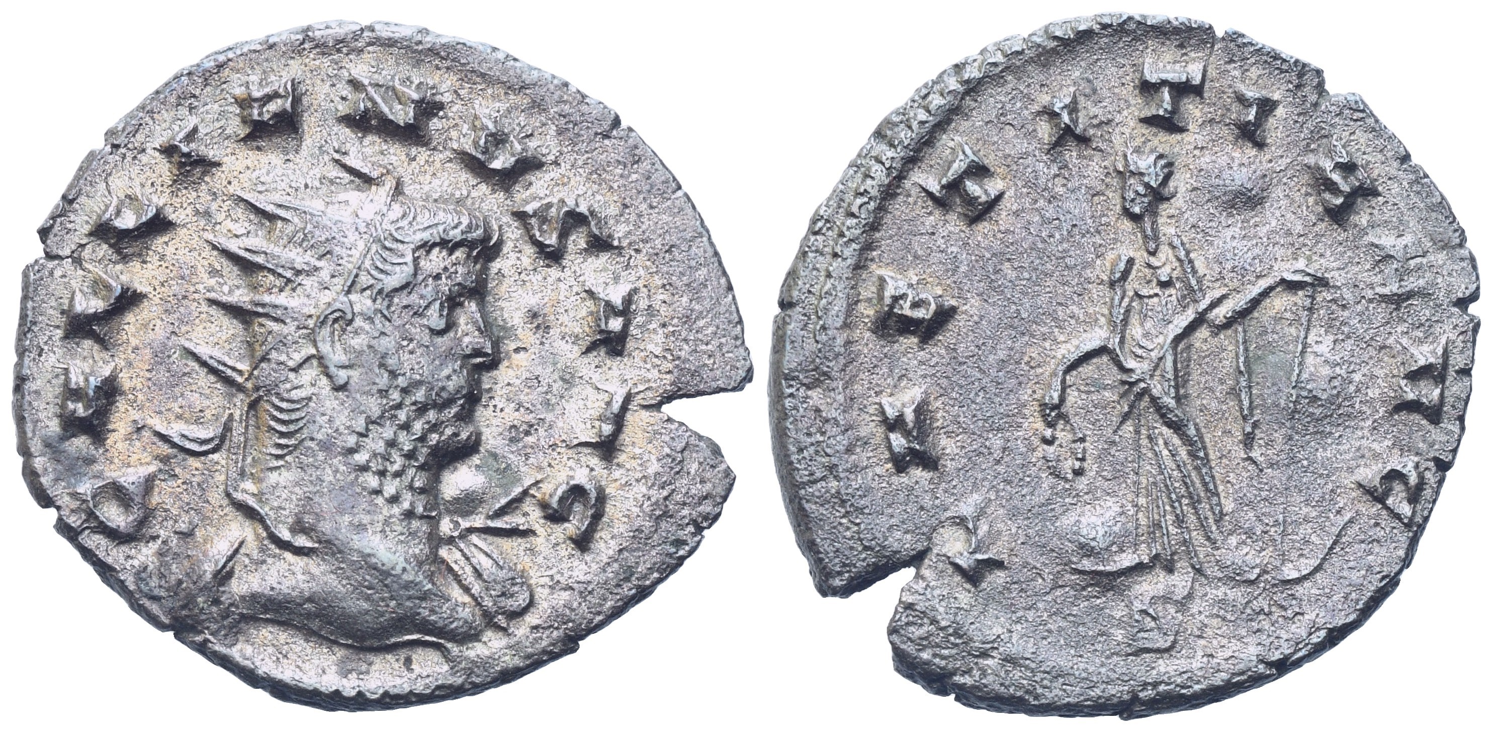 GALLIENVS AVG Radiate bust of Gallienus r., slight drapery on far shoulder; Rv. LAETITIA AVG - Laetitia standing facing, head l., holding wreath and anchor. RIC 489. VF