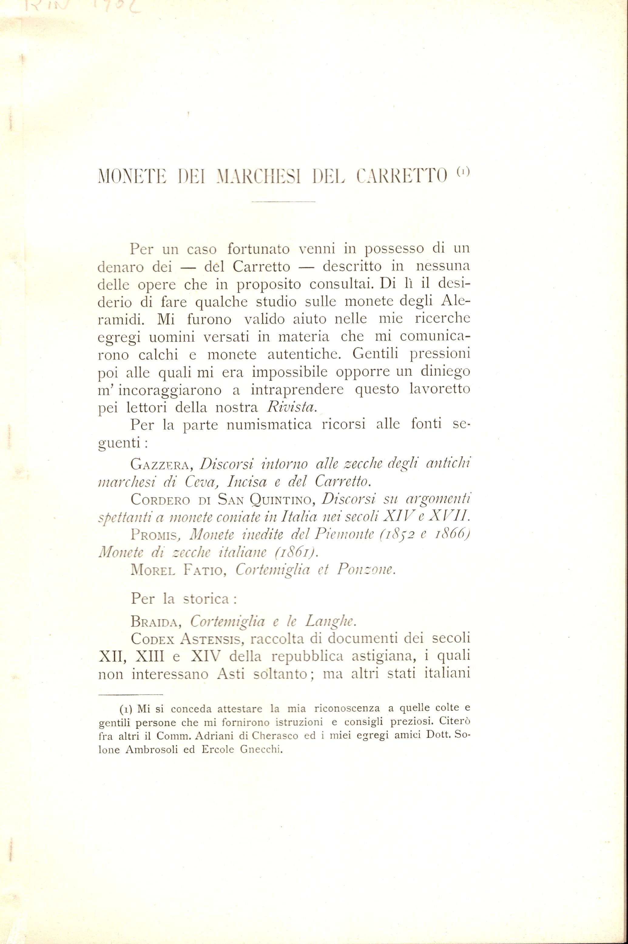 GAVAZZI Giuseppe - Monete dei Marchesi del Carretto. Milano, 1902. pp 67-85, illustrazioni nel testo. Brossura ed. buono stato, importante e raro.