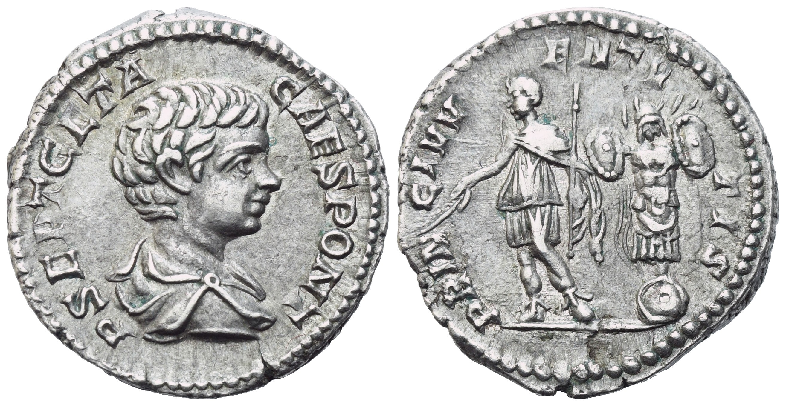 P SEPT GETA CAES PONT Bust of Geta, bare-headed, draped, r.; Rv. PRINC IVVENTVTIS Geta, in military attire, standing l., holding branch in r. hand and spear in l. hand; behind, trophy. RIC 18; Cohen 157; BMC 234. About EF