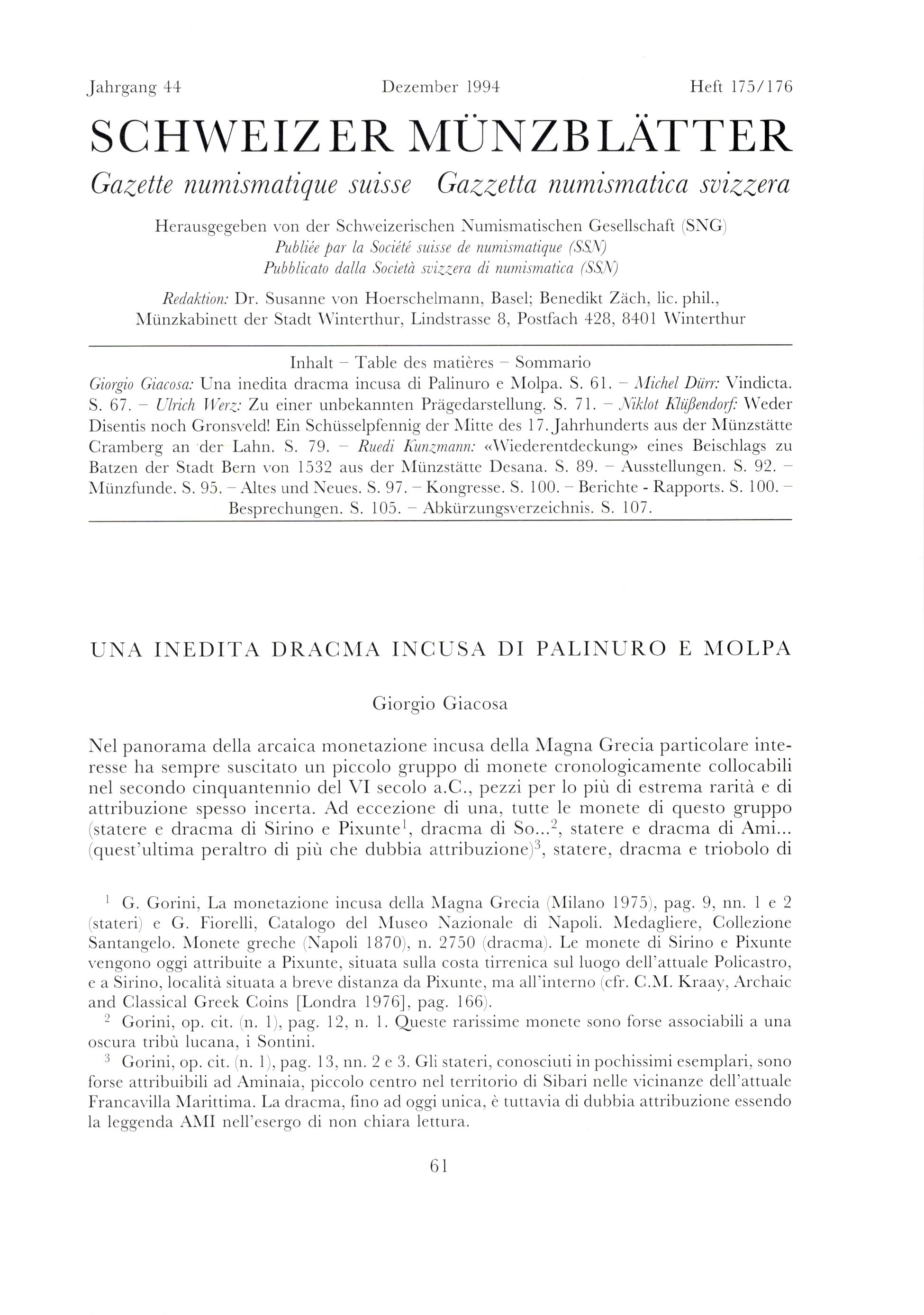 GIACOSA Giorgio - Una inedita dracma incusa di Palinuro e Molpa. Basel, 1994. pp 61- 66, illustrazioni nel testo. brossura ed. ottimo stato. fasc. completo