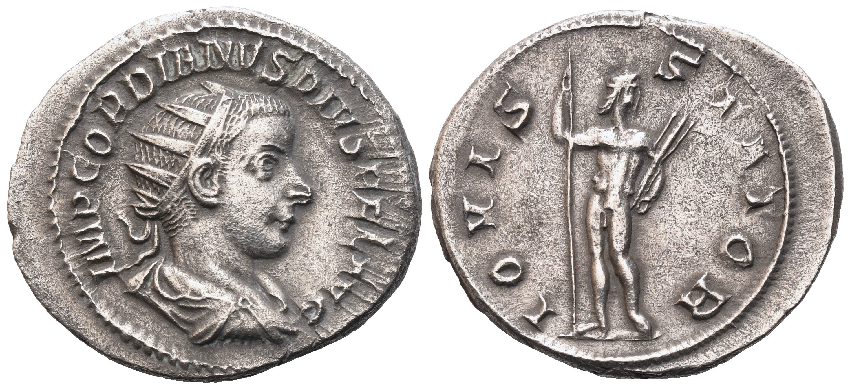 IMP GORDIANVS PIVS FEL AVG, radiate, draped and cuirassed bust to right / IOVIS STATOR, Jupiter standing facing, head to right, holding thunderbolt and long sceptre. RIC IV 85; RSC 115. Near extremely fine.
