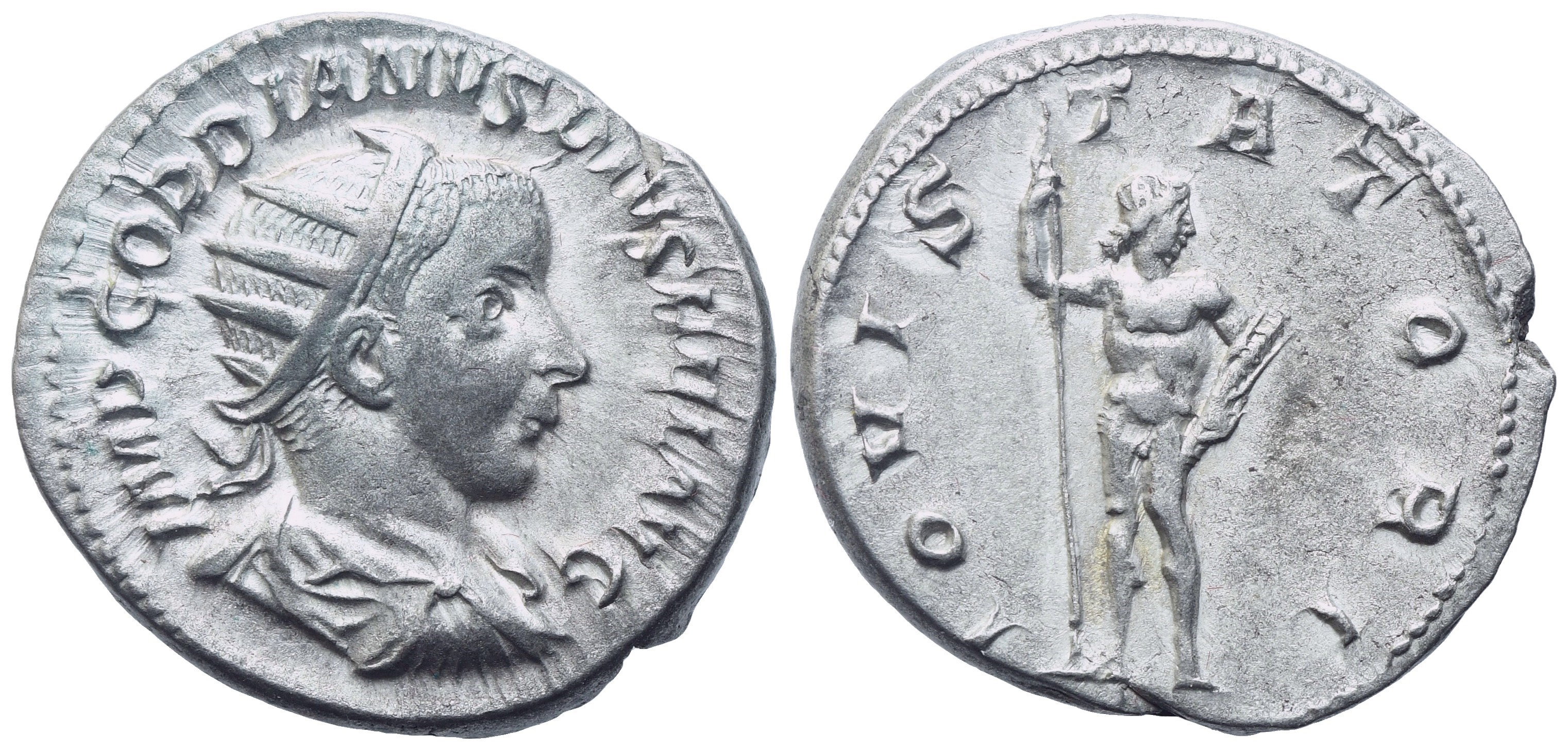 IMP GORDIANVS PIVS FEL AVG Radiate and draped bust r.; Rv. IOVI STATORI Jupiter standing r. with sceptre and thunderbolt. RIC 84; RSC 109. aEF