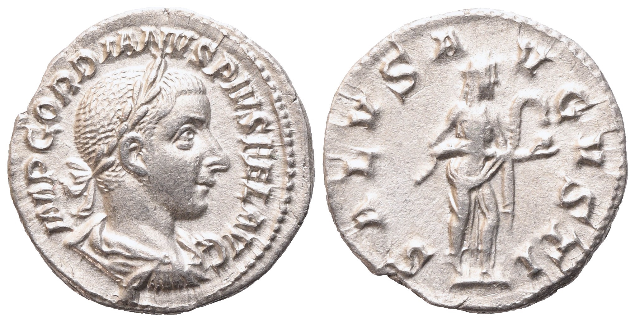 IMP GORDIANVS PIVS FEL AVG Laureate, draped and cuirassed bust of Gordian III to right. Rev. SALVS AVGVSTI Salus standing right, feeding a serpent from a patera held in her right hand. Cohen 325. RIC 129a. EF / aEF