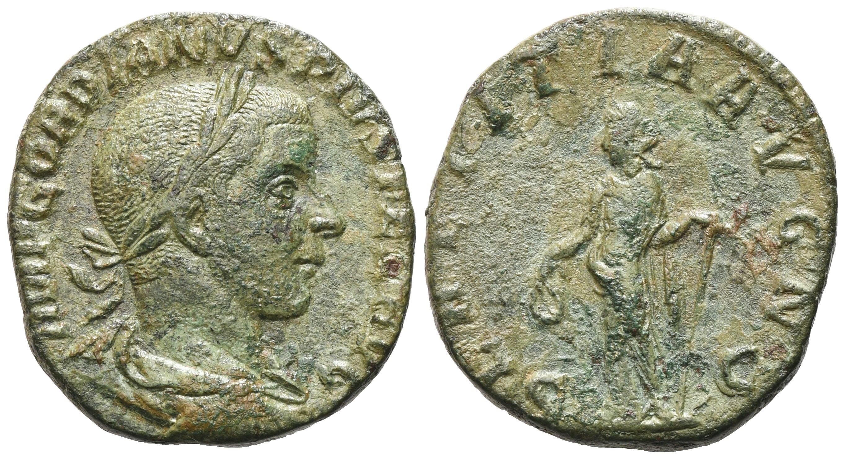 IMP GORDIANVS PIVS FEL AVG Laureate, draped and cuirassed bust r.; Rv. LAETITIA AVG N / S - C Laetitia standing l., holding wreath and anchor. RIC IV, 3, p. 48, 300a. Light green patina. Good very fine.