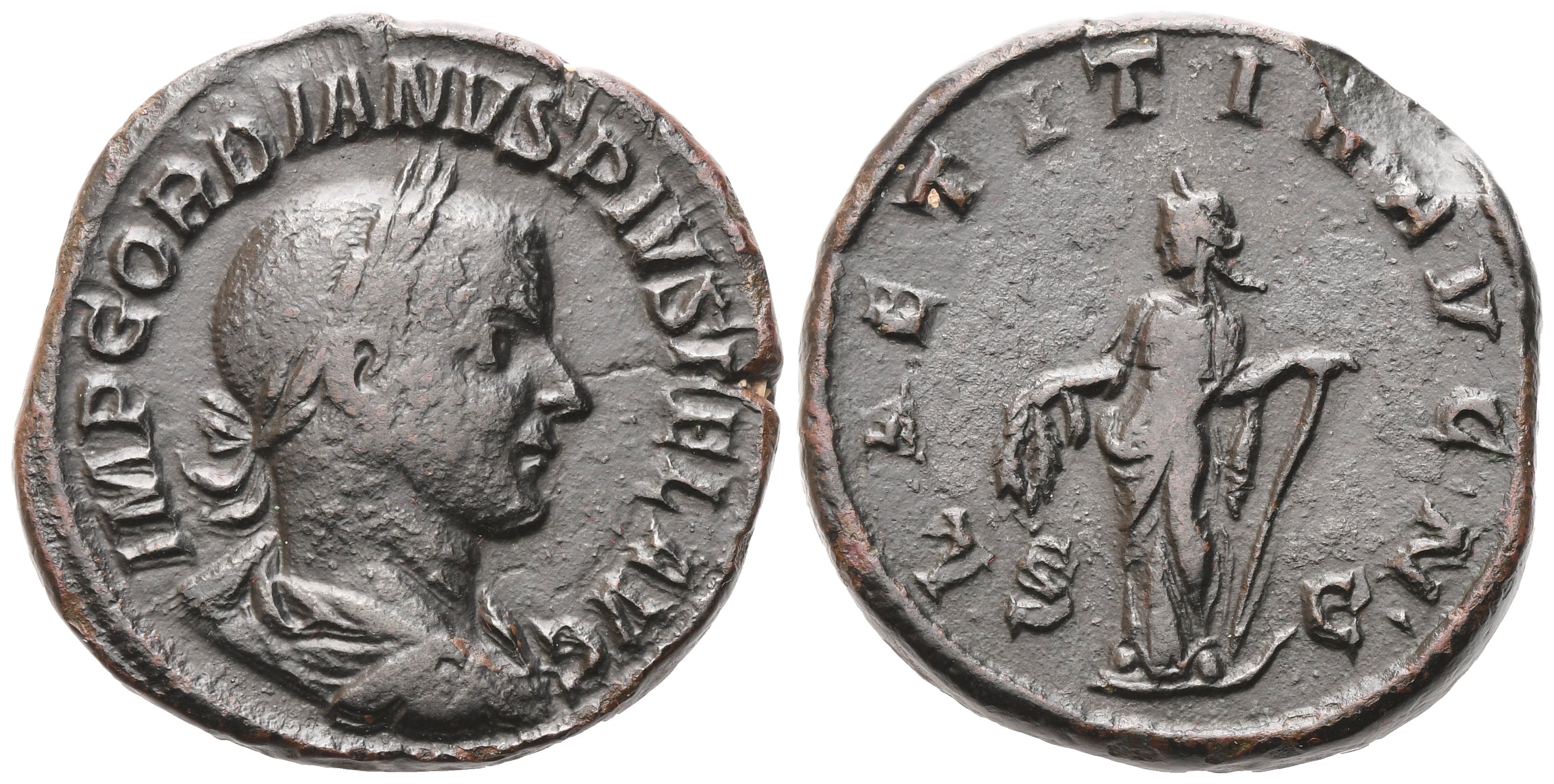 IMP GORDIANVS PIVS FEL AVG Laureate, draped and cuirassed bust r.; Rv. LAETITIA AVG N / S - C Laetitia standing l., holding wreath and anchor. RIC IV, 3, p. 48, 300a. Light green patina. Dark brown patina. gVF