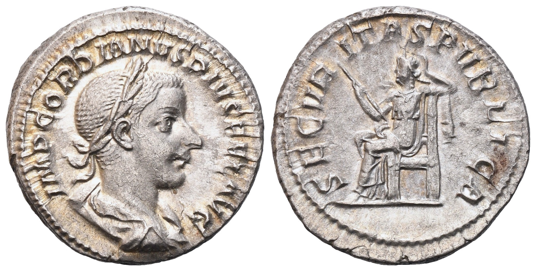 IMP GORDIANVS PIVS FEL AVG Laureate, draped and cuirassed bust of Gordian III to r.; Rv. SECVRITAS PVBLICA Securitas seated left on throne, holding scepter and resting head upon hand. Cohen 340. RIC 130. Near EF.