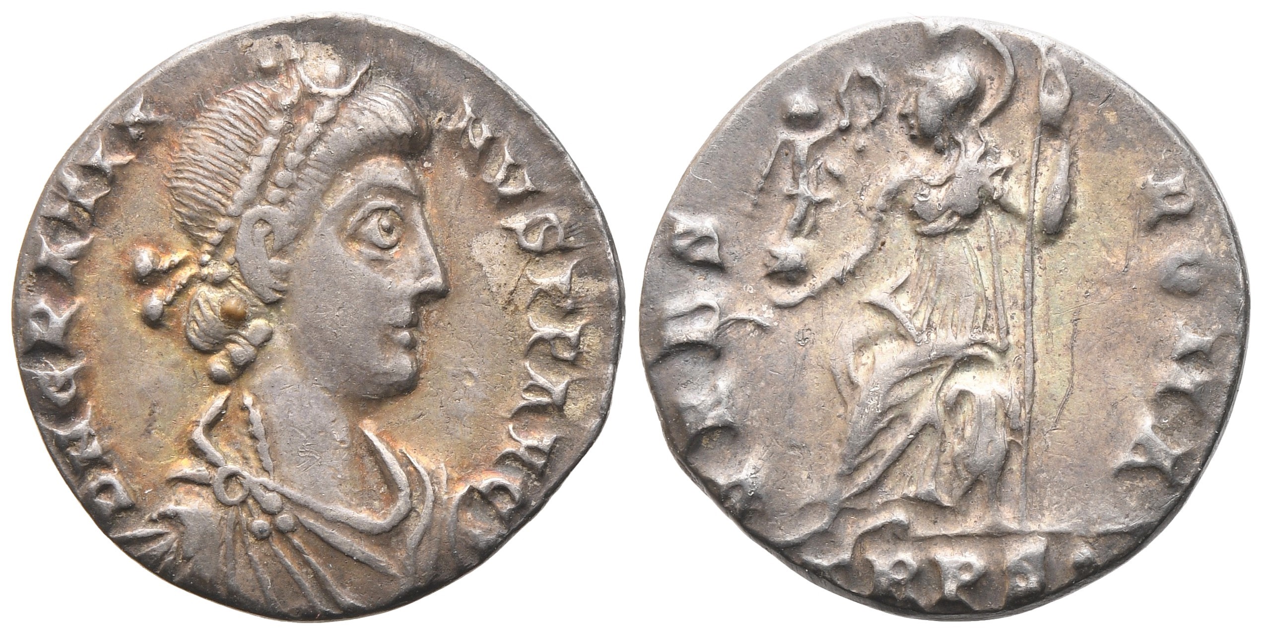 D N GRATIANVS P F AVG Pearl-diademed, draped and cuirassed bust to r.; Rv. VRBS ROMA, Roma seated to l., holding spear and Victory on globe; TRPS• in exergue. RIC IX 27c.. Very fine.