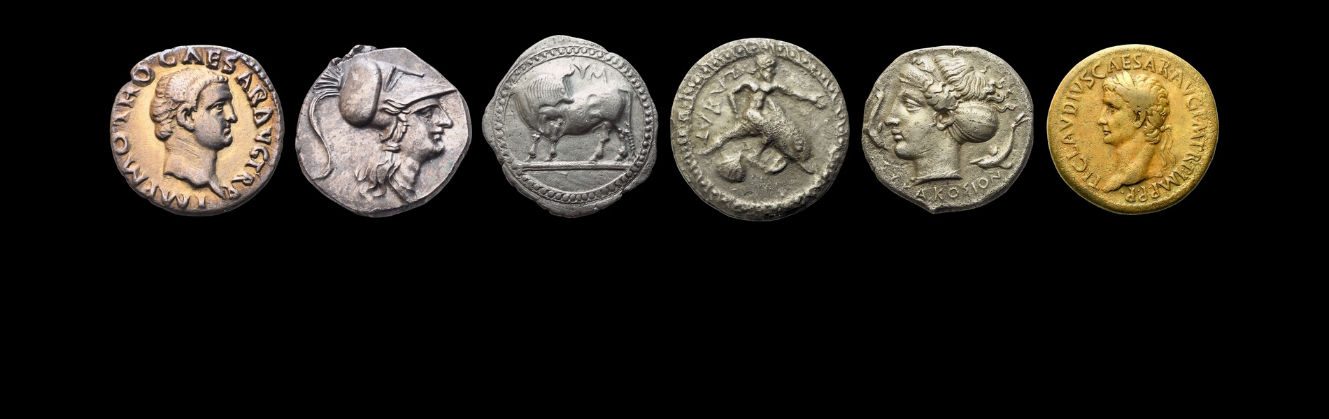 Kl... and Ari..., magistrates. Nude, helmeted rider on horse galloping to r., stabbing with spear held in his r. hand and holding two other spears and shield in his l.; to upper left, Ξ; below horse, ΑΡΙ; Rv. ΤΑΡΑΣ Youthful oikist, nude, riding dolphin to l., holding kantharos in his r. hand and rudder [..]