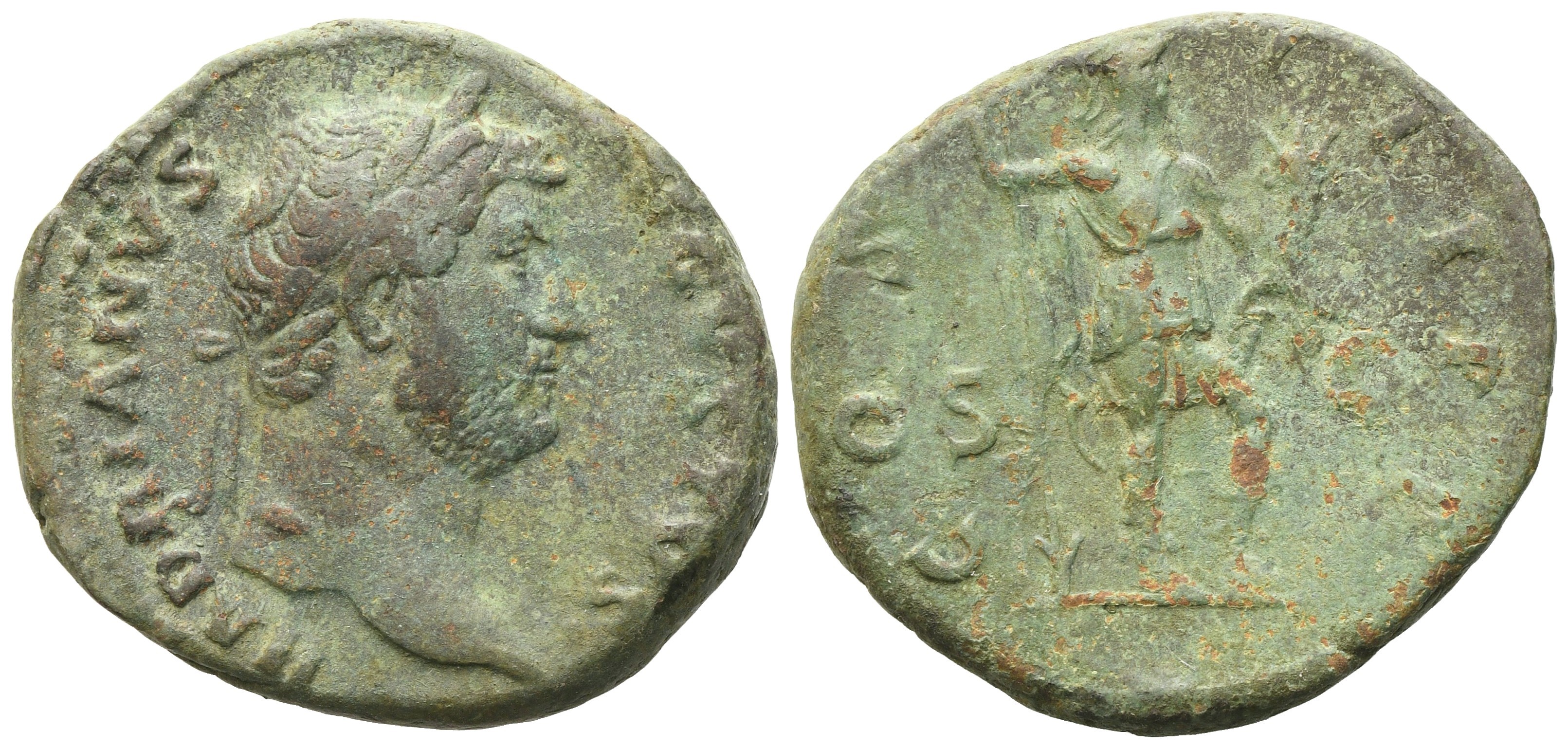 HADRIANVS AVGVSTVS Laureate haed r.; Rv. COS III PP / S β C Roma standing r., l. foot on helmet, holding spear and cornucopia. RIC 716. Nice green patina. Good very fine / very fine.
