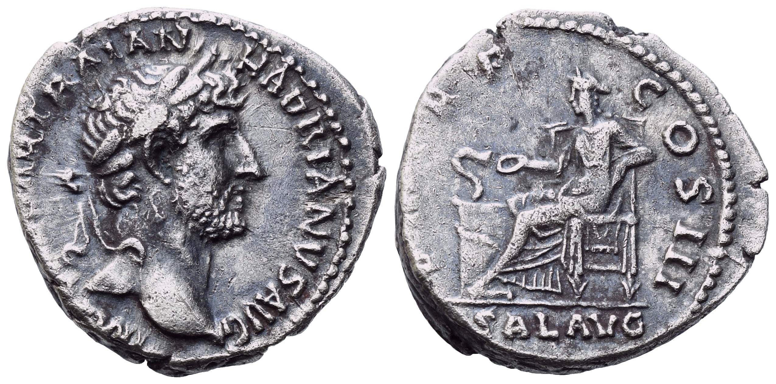 IMP CAESAR TRAIAN HADRIANVS AVG Laureate bust of Hadrian r.; Rv. P M TR P COS III / SAL AVG Salus seated l., holding patera, feeding snake rising from altar. RIC 137a. Good very fine.