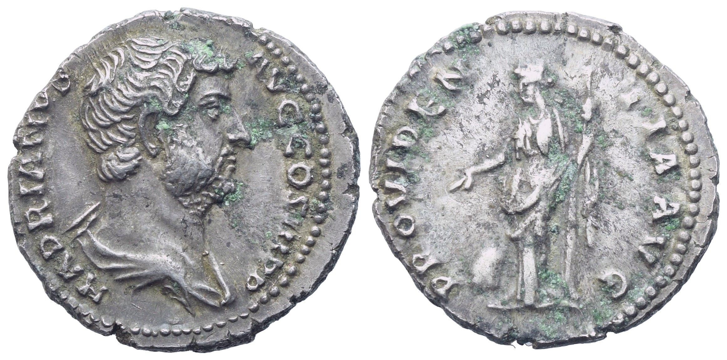 HADRIANVS AVG COS III PP Draped bust r.; Rv. PROVIDENTIA AVG Providentia standing l. with globe and sceptre. RIC 261. SOme green encrustations otherwise VF.