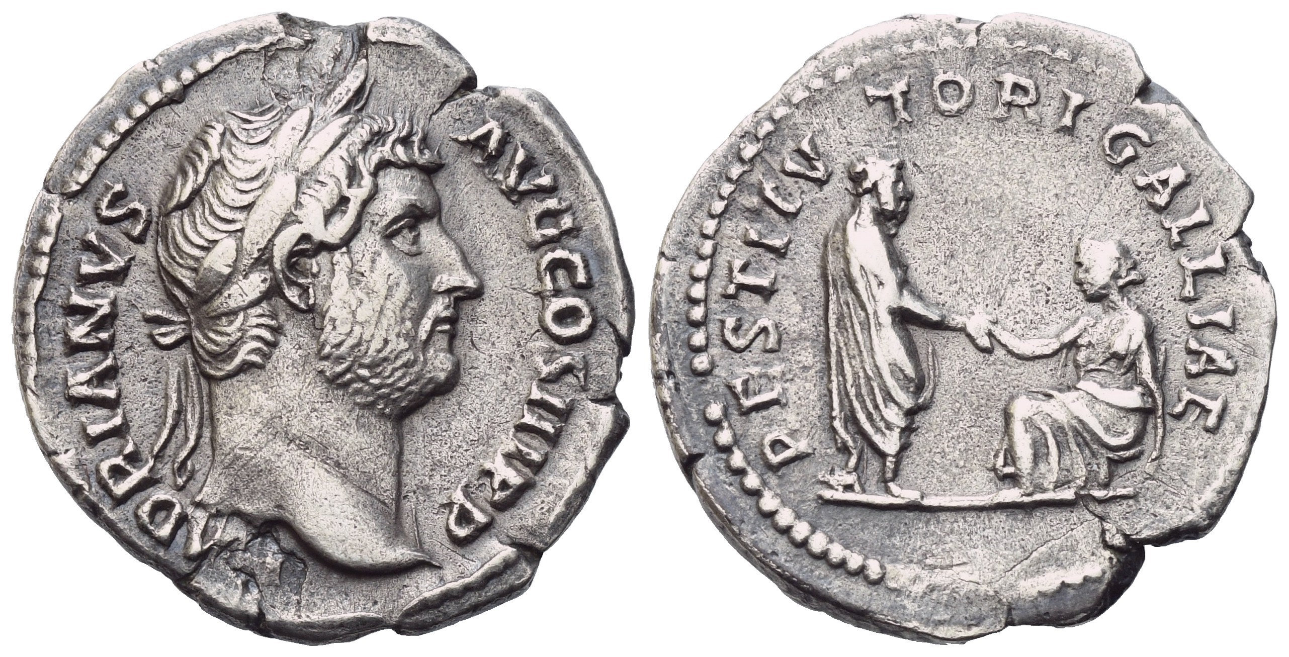 HADRIANVS AVG COS III P P Laureate head of Hadrian to r.; Rv. RESTITVTORI GALLIAE Hadrian, togate, standing r., holding roll in his l. hand, raising up Galliae, who kneels to left before him. BMC 878. Cohen 1247. RIC 1573. About extremely fine.