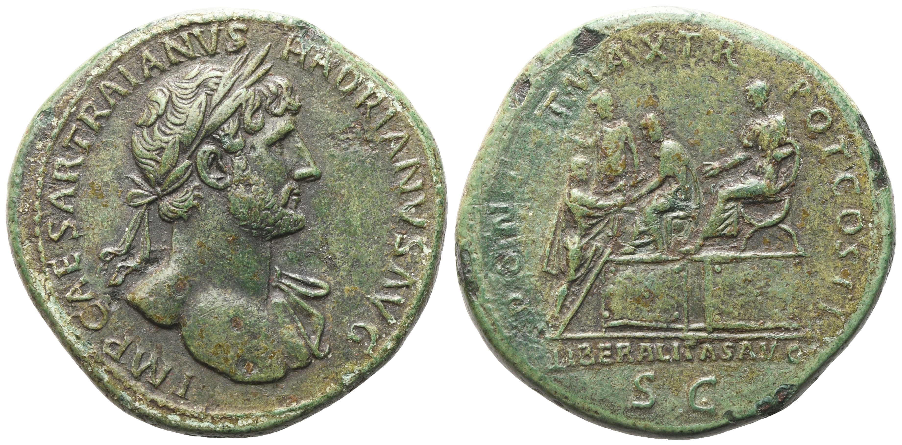 IMP CAESAR TRAIANVS HADRIANVS AVG P M TR P COS III Laureate head of Hadrian to r., with slight drapery on his l. shoulder; Rv. PONT MAX TR POT COS II // LIBERALITAS AVG / S β C Hadrian seated left on platform, extending his r. arm toward citizen; in front of him, Liberalitas standing front, head to l., holding counting-board in her r. hand, and an officer seated to l. and making distribution to citizen standing to r. on steps, holding up fold of toga. RIC 163; Cohen 914. Good very fine / very fine.