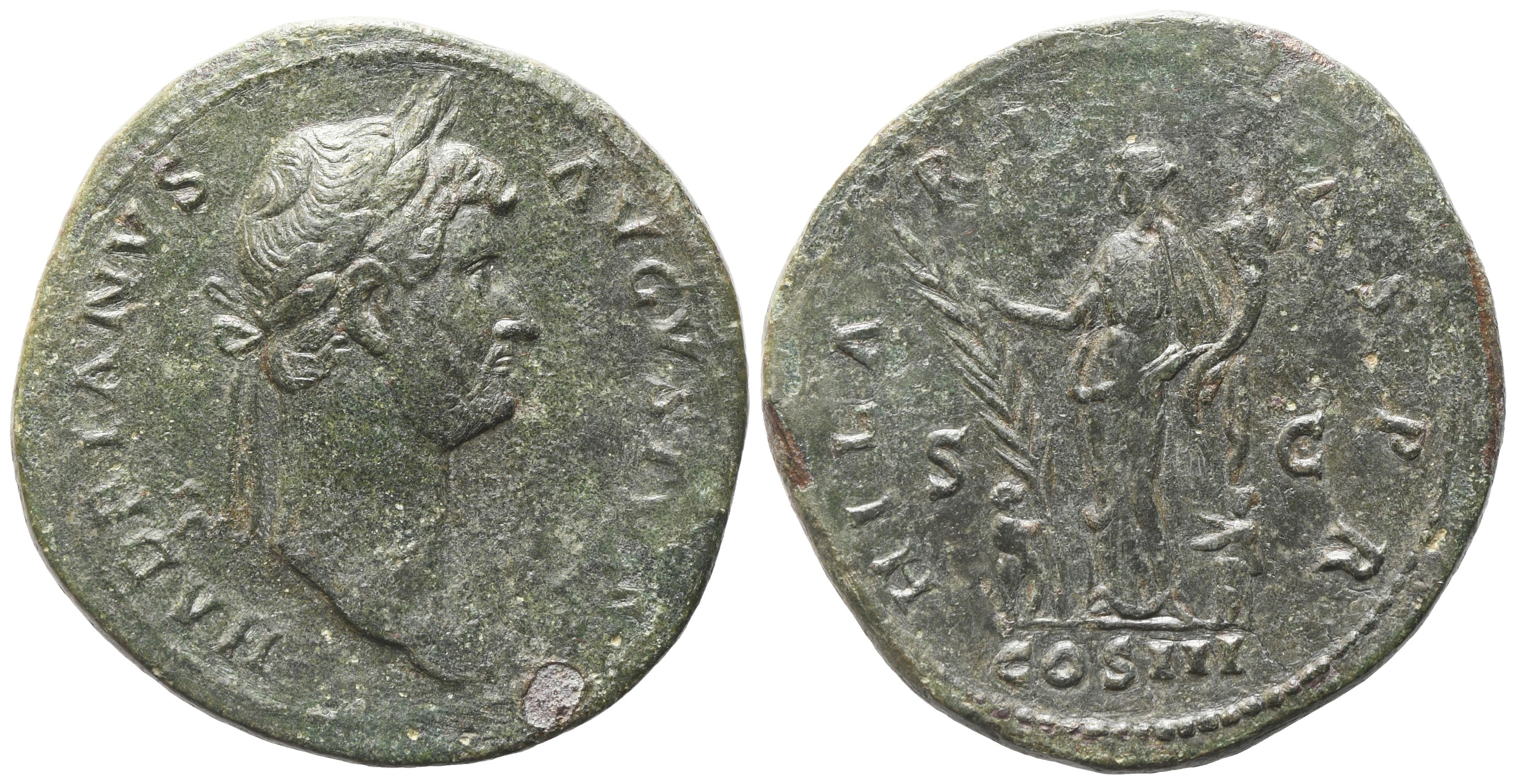 HADRIANVS AVGVSTVS P P Laureate bust r.; Rv. HILARITAS P R / COS III / SC Hilaritas standing facing, head l., holding long palm branch and cornucopia; a small child to either side. RIC 970c. Dark green patina. Good very fine.