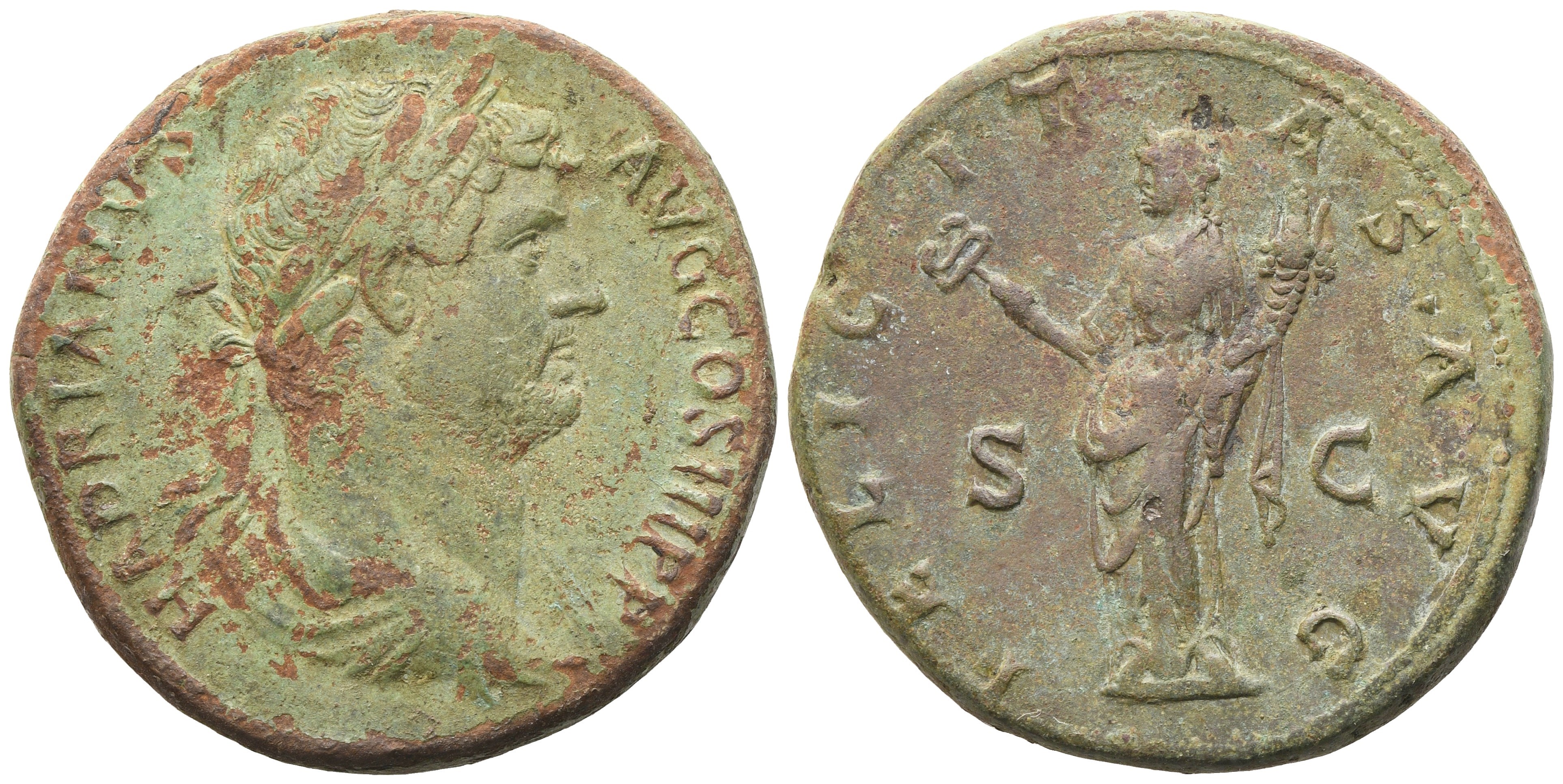HADRIANVS AVG COS III PP Draped bust r.; Rv. FELICITAS AVG / S β C Felicitas standing l. holding caduceus and cornucopia. RIC 748. Green patina with red shades. Good very fine.