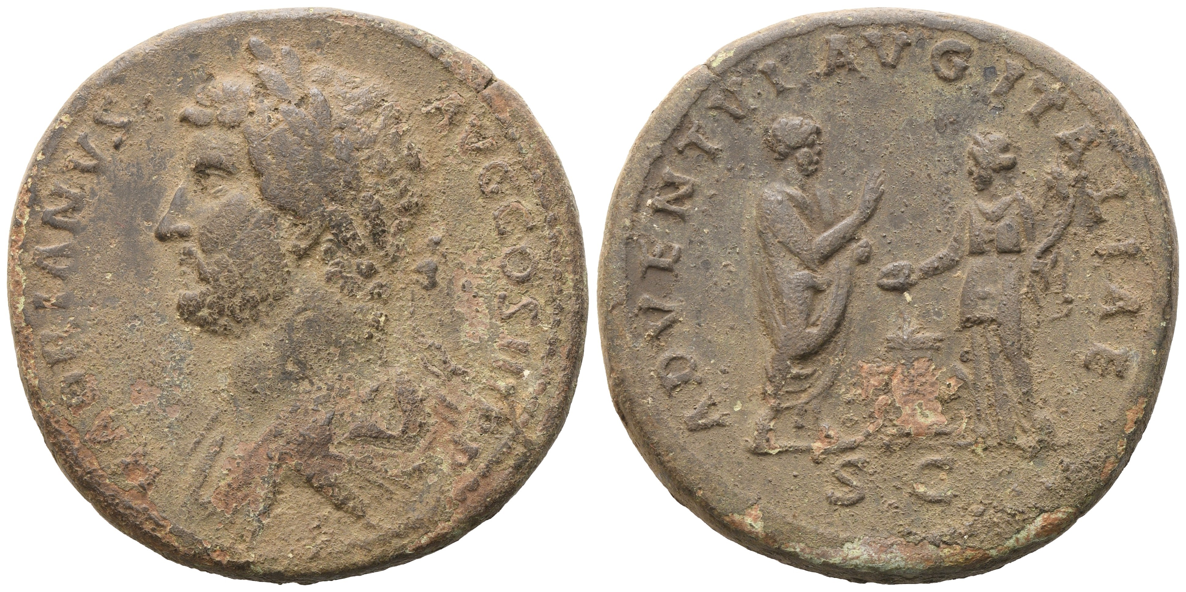 HADRIANVS AVG COS III PP Bareheaded and draped bust l.; Rv. ADVENTVI AVG ITALIAE Hadrian, togate, standing r., raising hand and holding volumen, facing Italia, wearing tunic, standing l., sacrificing from patera over altar and holding cornucopia; sacrificial victim to r. of altar. RIC II 888; Banti 36. Untouched earthy brown patina. VF / gVF