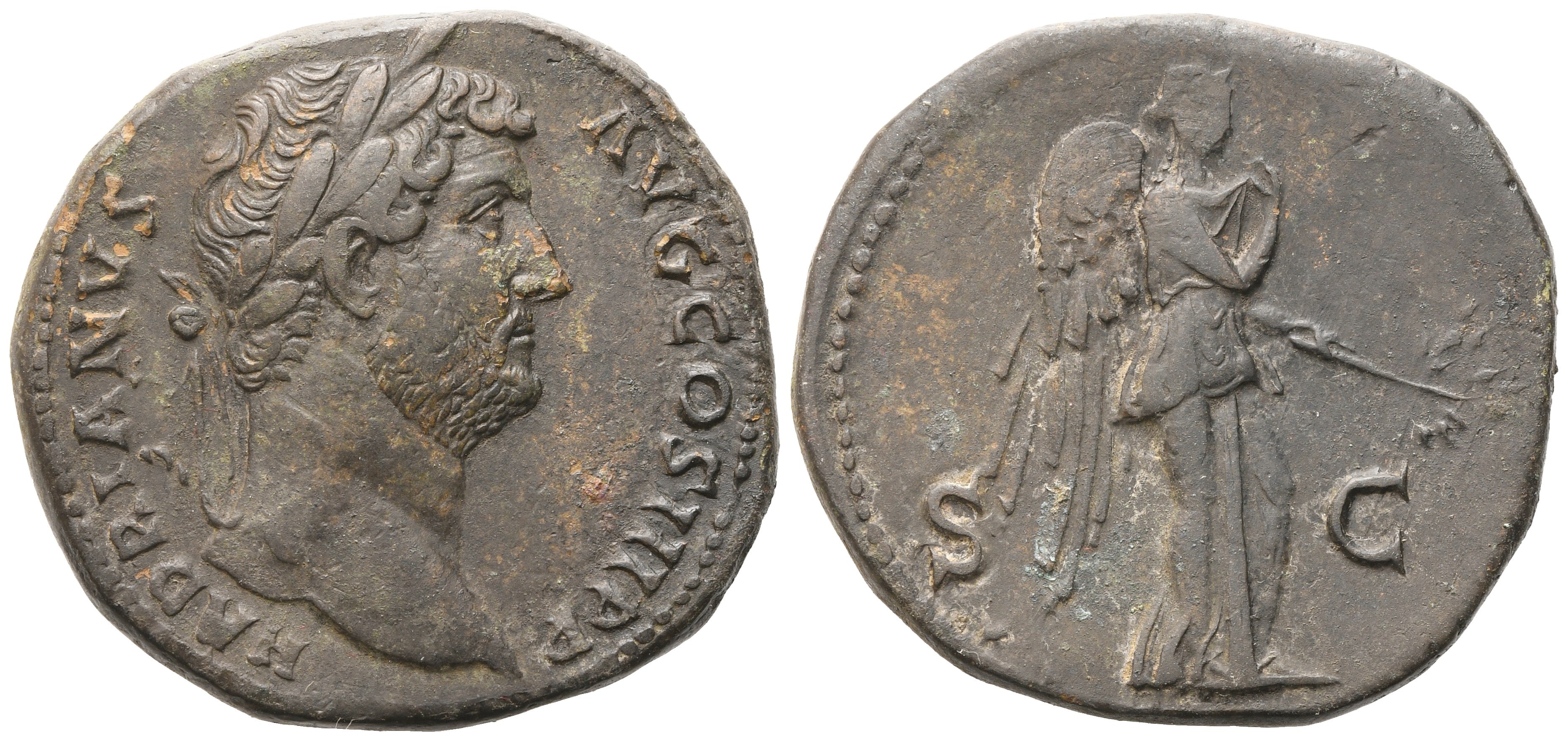 HADRIANVS AVG COS III PP Laureate bust r.; Rv. Victory-Nemesis advancing r., holding out fold of dress, with branch in l. hand, S β C across fields. RIC 779; Cohen 1374. Brown patina. About extremely fine / good very fine.