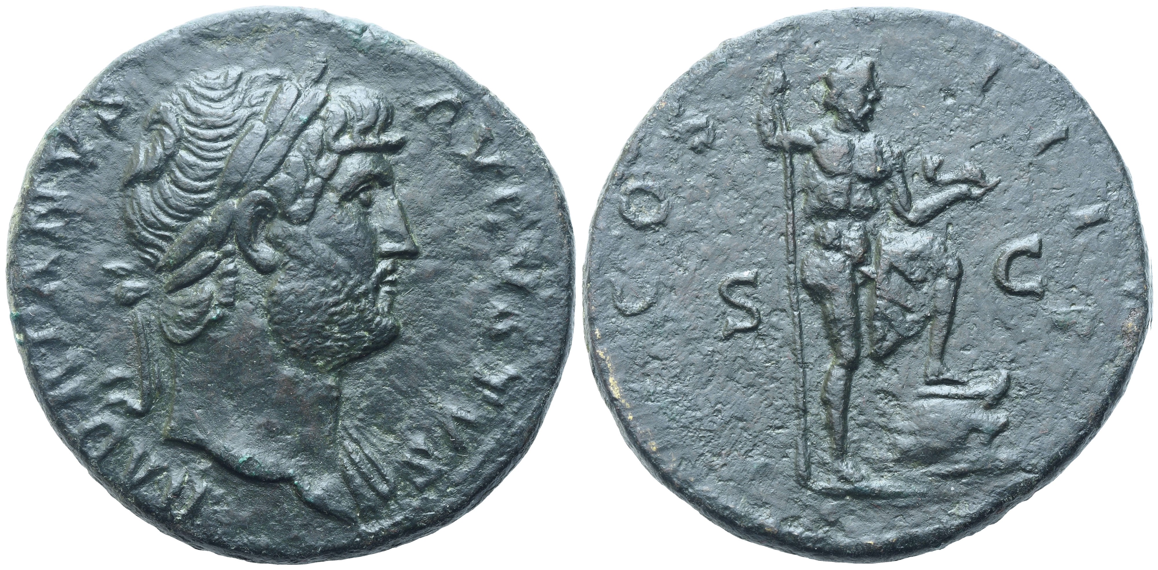 ADRIANVS AVGVSTVS Laureate bust to r., slight drapery on far shoulder; Rv. COS III Neptune standing to r., foot set on prow, holding trident and acrostolium; S-C across fields. RIC II.3 81. Dark blue-green patina. Good very fine.