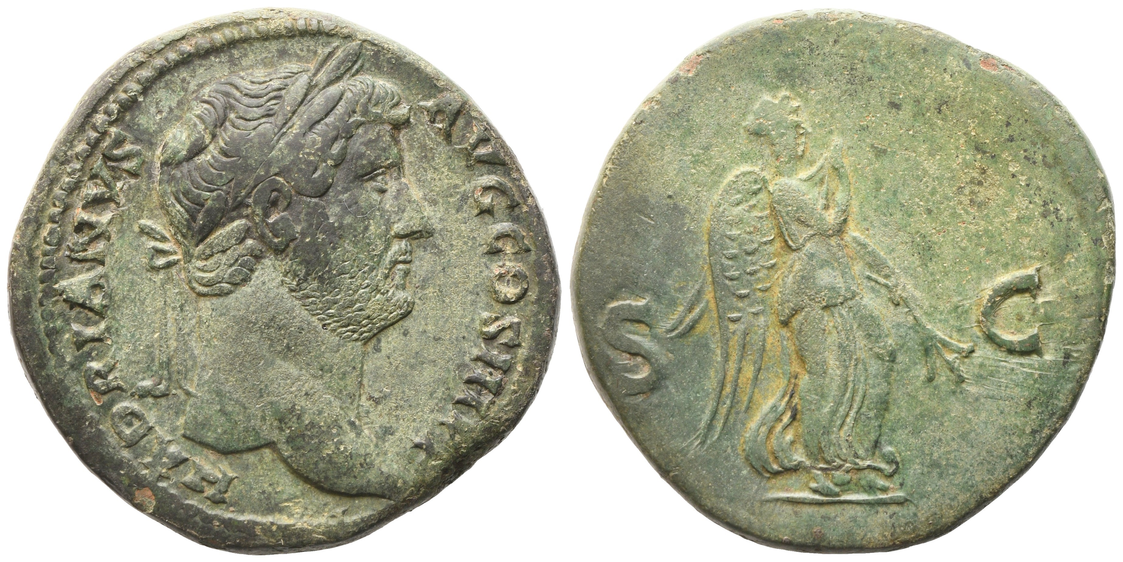 HADRIANVS AVG COS III PP Laureate bust r.; Rv. Victory-Nemesis advancing r., holding out fold of dress, with branch in l. hand, S β C across fields. RIC 779; Cohen 1374. Lovely green patina. Good very fine.