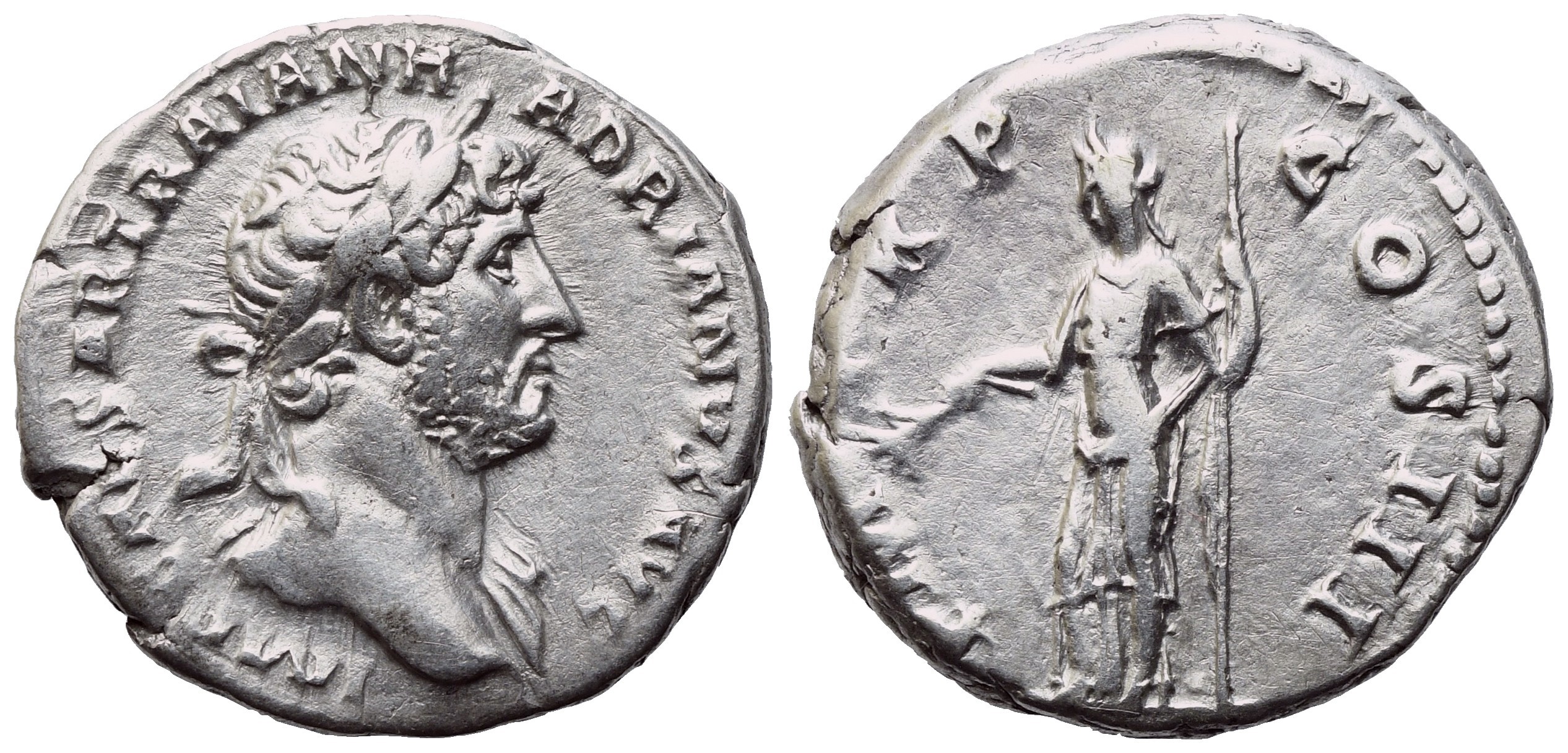 IMP CAESAR TRAIAN HADRIANVS AVG Laureate bust r.; Rv. PM TRP COS III - Pax standing l. with branch and sceptre. RIC 94. Good very fine. Lustrous specimen.