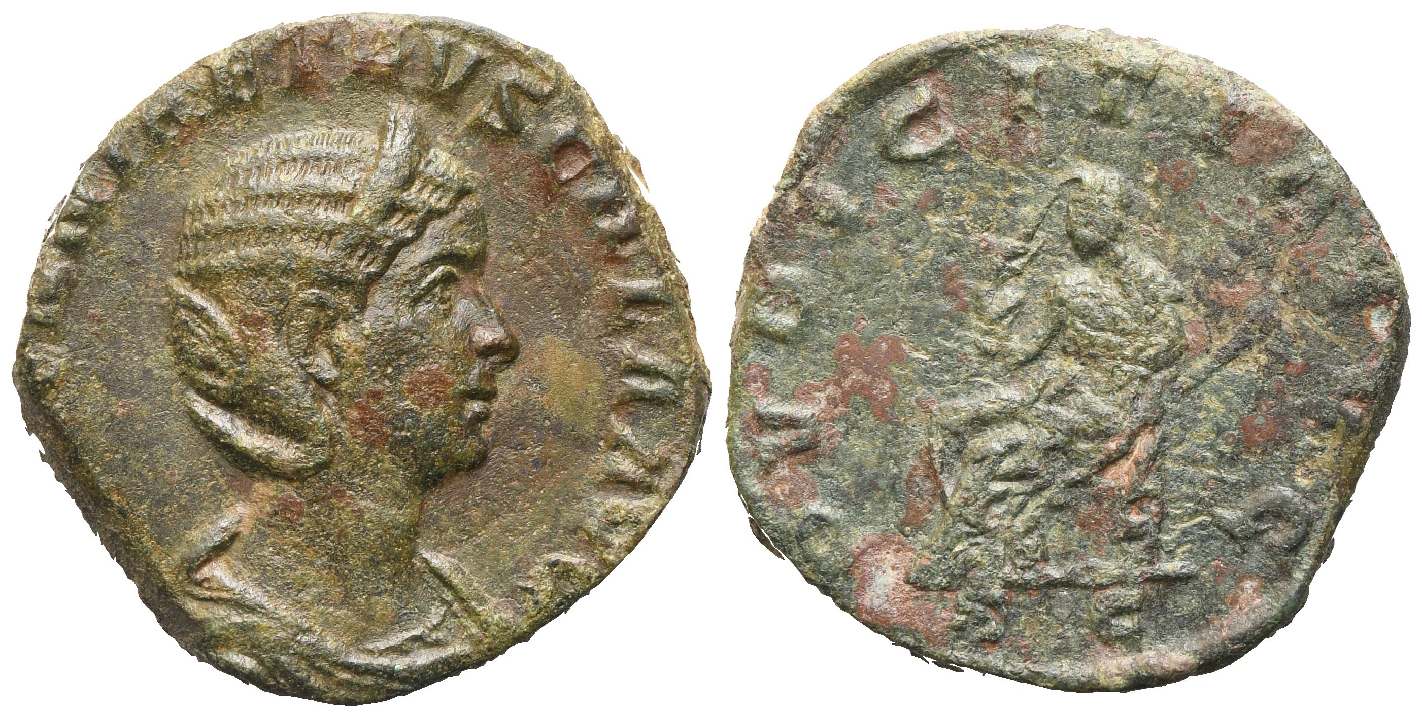 HERENNIA ETRVSCILLA AVG Diademed and draped bust r.; Rv. PVDICITIA AVG Pudicitia seated l., drawing veil and holding sceptre; SC in exergue. RIC IV 136b (Trajan Decius); C. 22. Green-brown patina with red highlights. gVF / VF