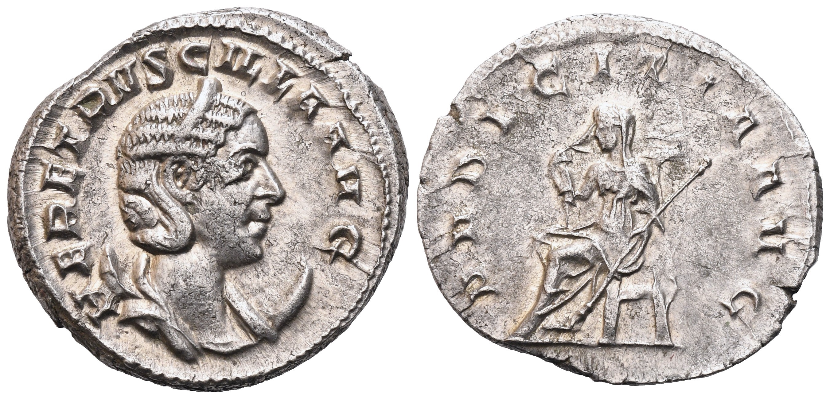 HER ETRVSCILLA AVG Diademed and draped bust of Herennia Etruscilla to r., set on crescent; Rv. PVDICITIA AVG Pudicitia seated l. on a high throne, drawing veil from face and holding sceptre. RIC IV.3, 59b. Good very fine / very fine.