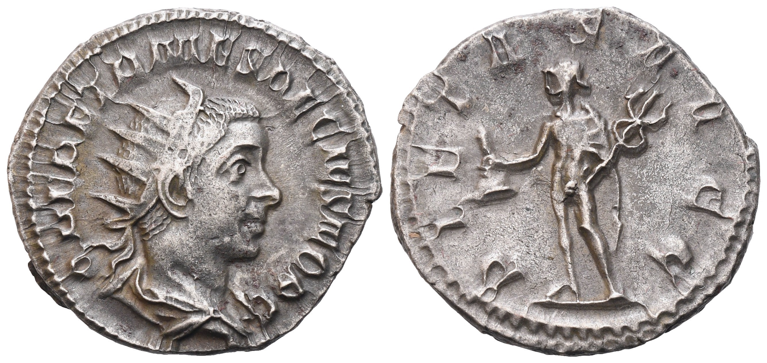 Q HER ETR MES DECIVS NOB C, radiate and draped bust of Herennius Etruscus to right. Rev. PIETAS AVGG, Mercury standing left, holding purse and caduceus. RIC 142b; Sear 9520; RSC 11. Good very fine.