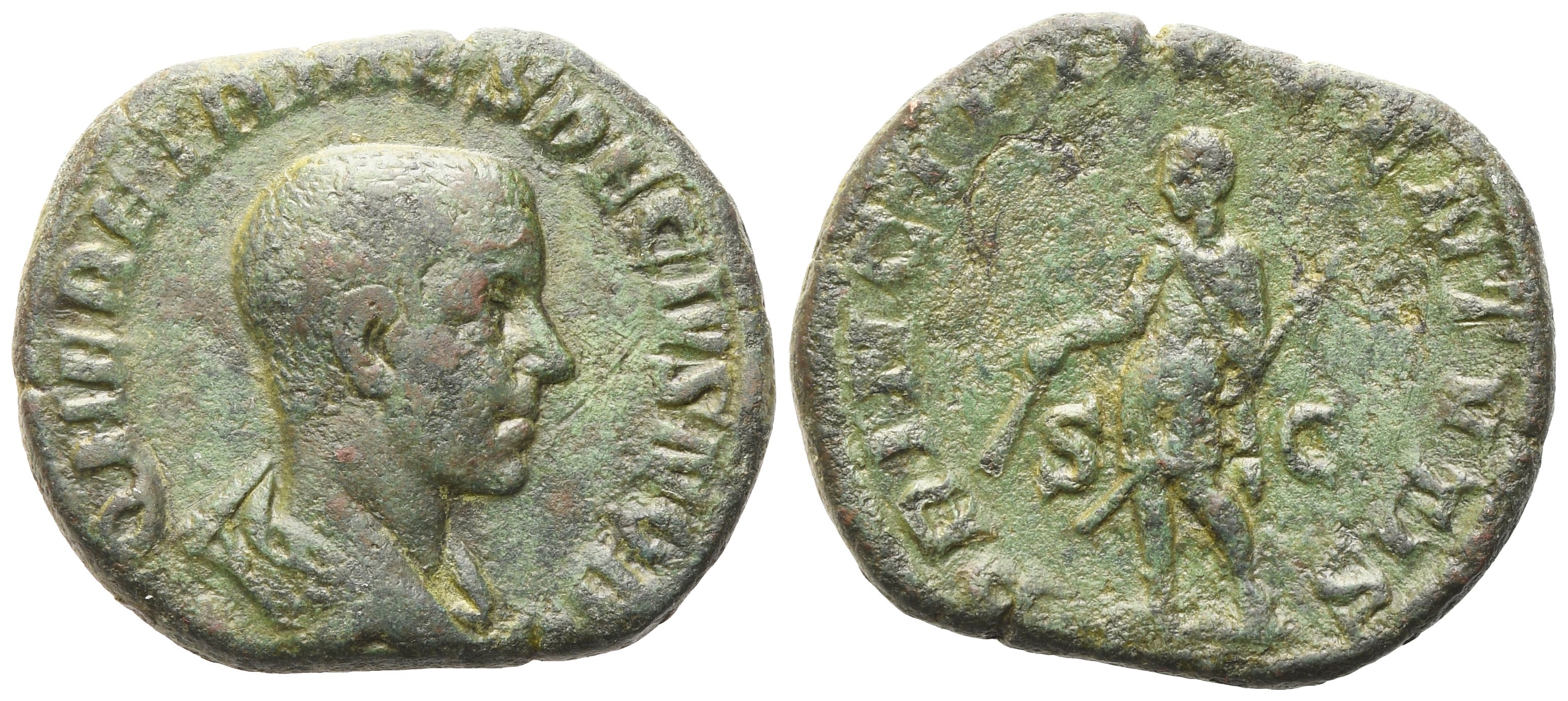 Q HER ETR MES DECIVS NOB C Bare-headed, draped and cuirassed bust to r.; Rv. PRINCIPI IVVENTVTIS / S - C, Prince standing l. in military dress, holding spear and baton. RIC 171a. Light green patina. VF