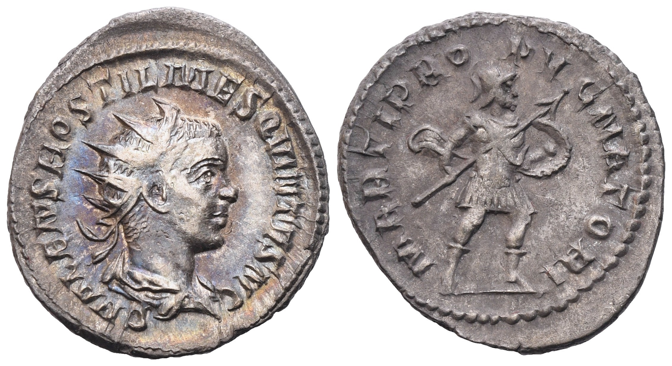 C VALENS HOSTIL MES QVINTVS N C Bust of Hostilian, radiate, draped, r.; Rv. MARTI PROPVGNATORI Mars, helmeted, in military attire, advancing r., holding spear in r. hand and shield in l. hand. RIC 177b; Cohen 15. Near extremely fine. Nice iridescence on the obverse.
