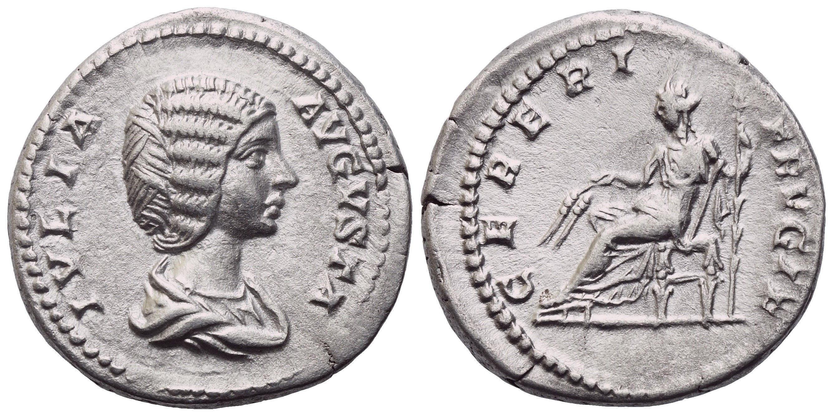VLIA AVGVSTA Draped bust of Julia Domna to r.; Rv. CERERI FRVGIF Ceres seated l., holding grain ears in r. hand and torch in l. BMC 10. Cohen 14. RIC 546. Extremely fine.